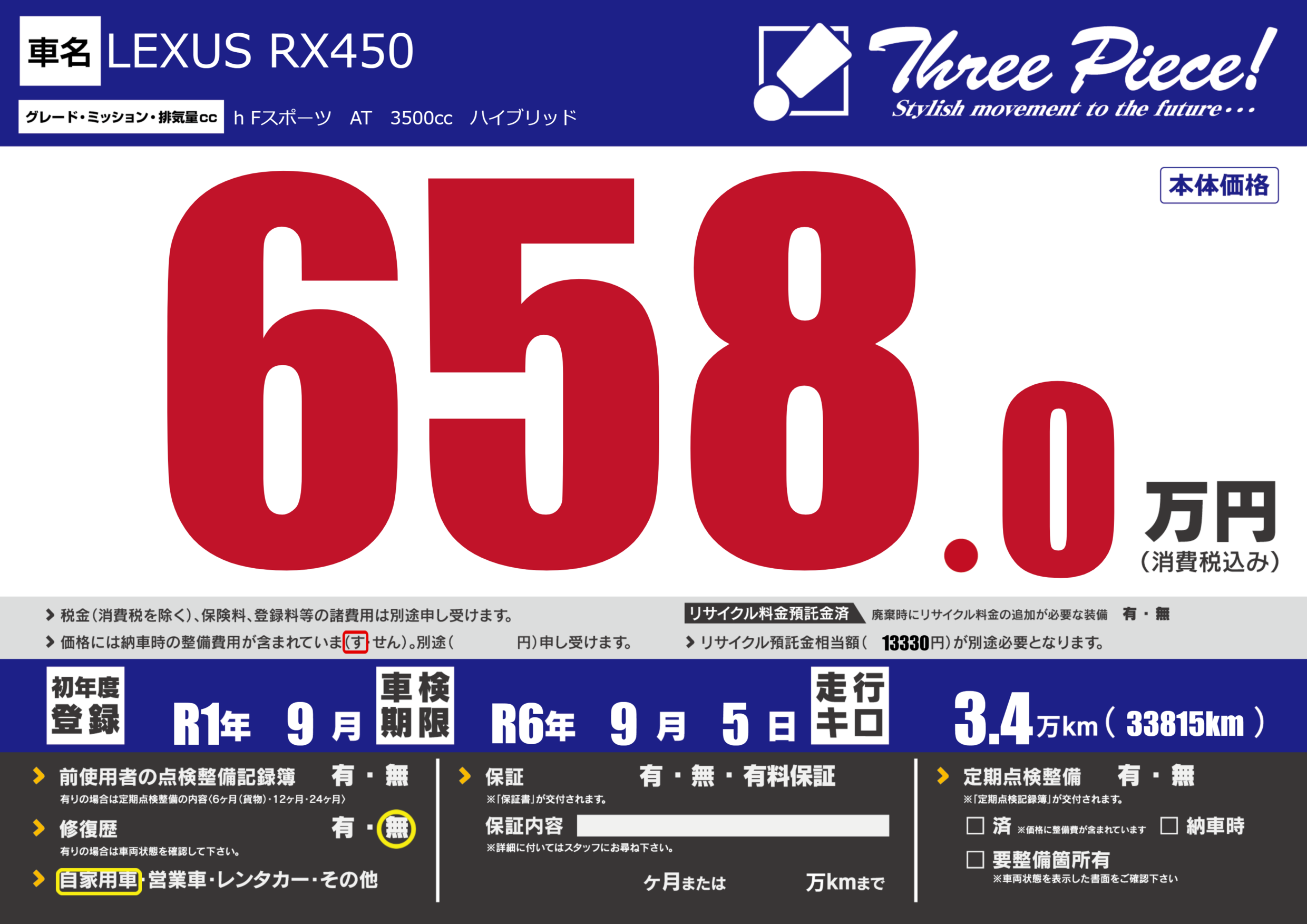 | 車名 | LEXUS RX450 | グレード ミッション 排気量 |