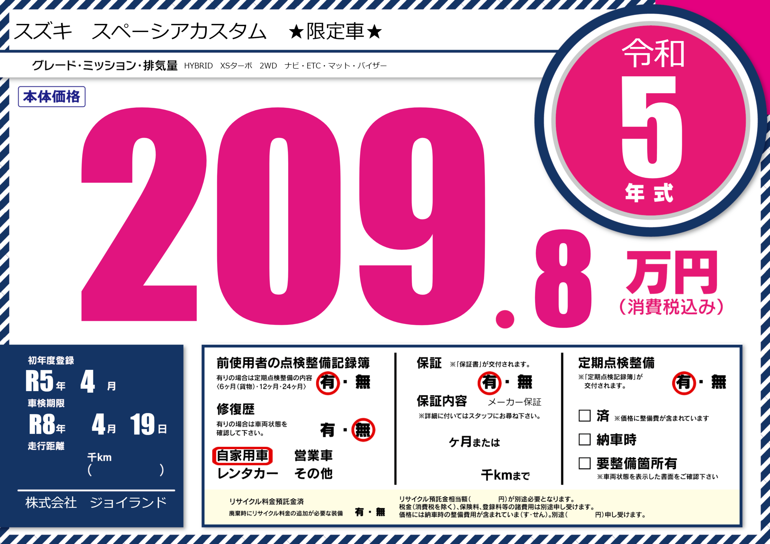 | 車名 | スズキ スペーシアカスタム ★限定車★ | グレード ミッション 排気量 |