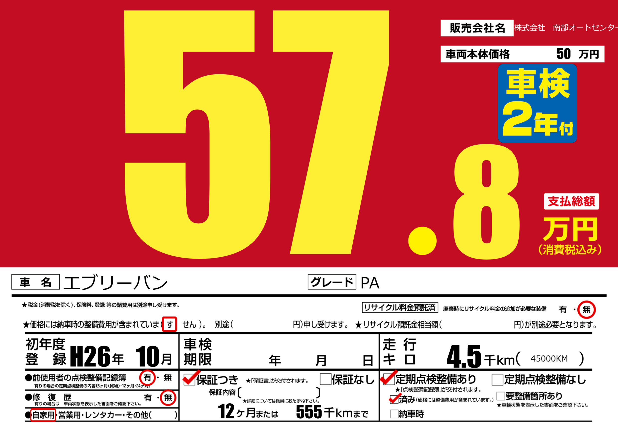 | 定期点検整備 | 定期点検整備あり 定期点検整備済み | ||