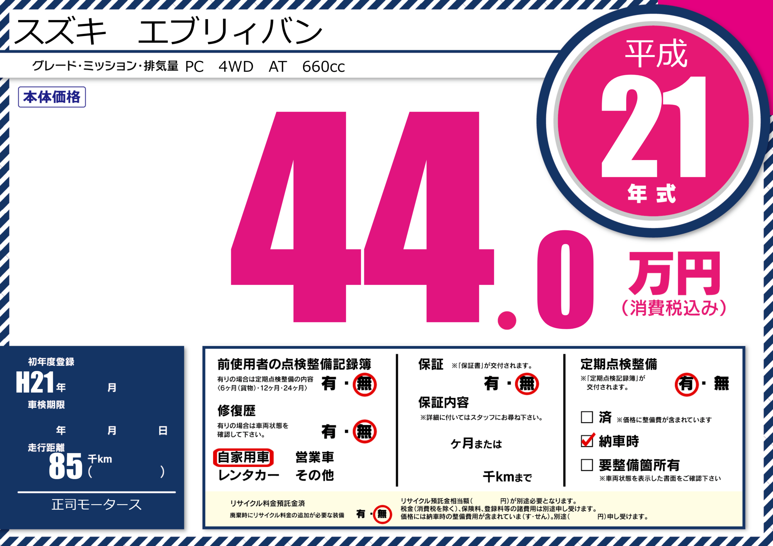 | 車名 | スズキ エブリィバン | グレード ミッション 排気量 |