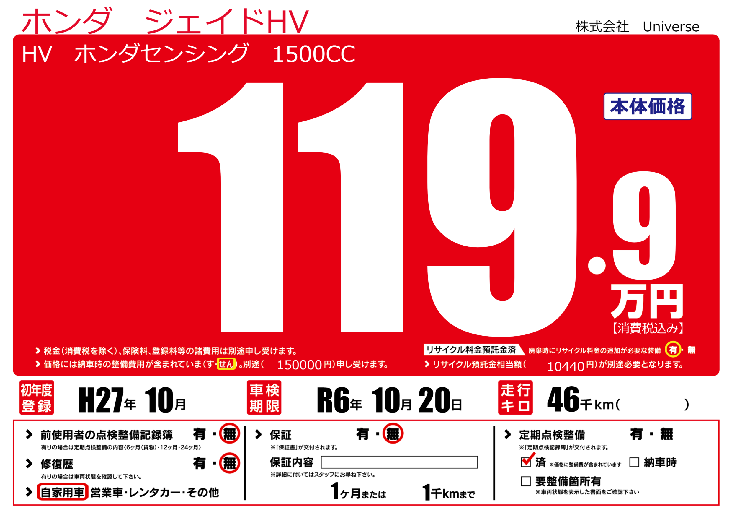 | 車名 | ホンダ ジェイドHV | グレード ミッション 排気量 |