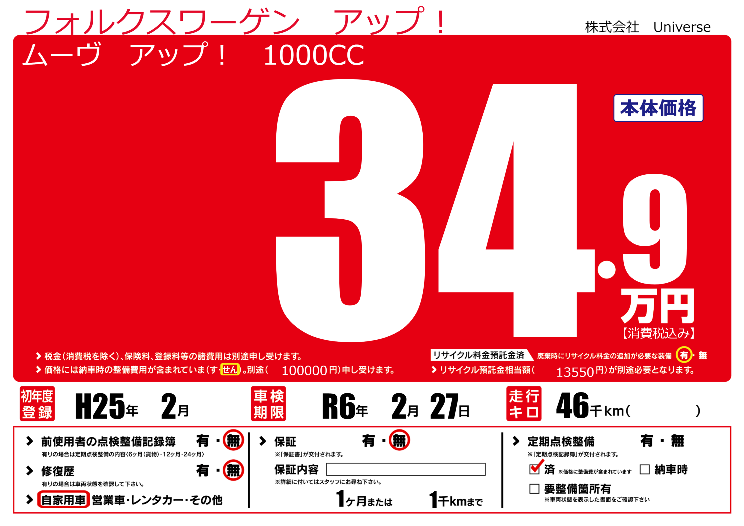 | 車名 | フォルクスワーゲン アップ! | グレード ミッション 排気量 |