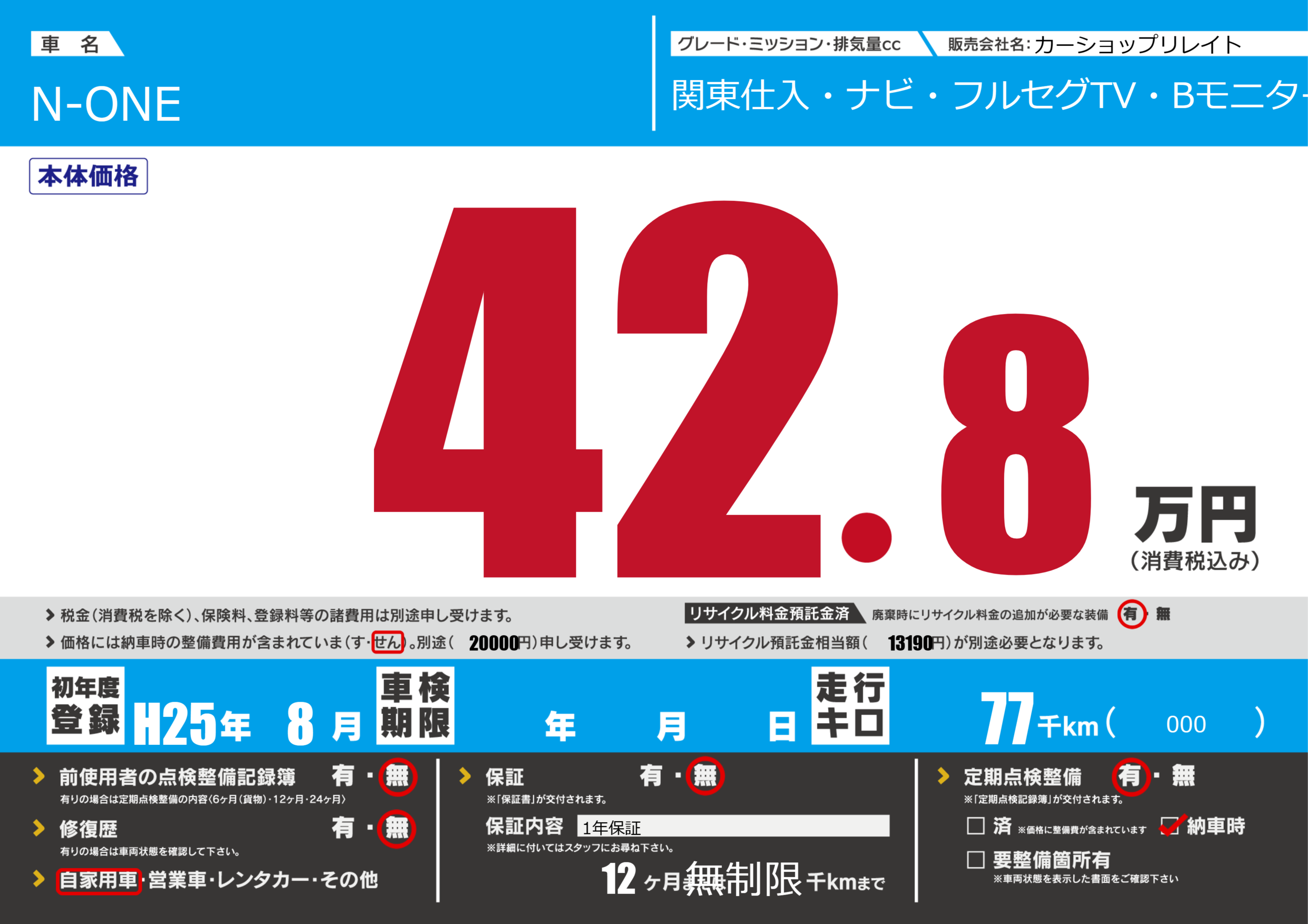 保証なし 保証内容(1年保証) 12ヶ月または(無制限)千kmまで |