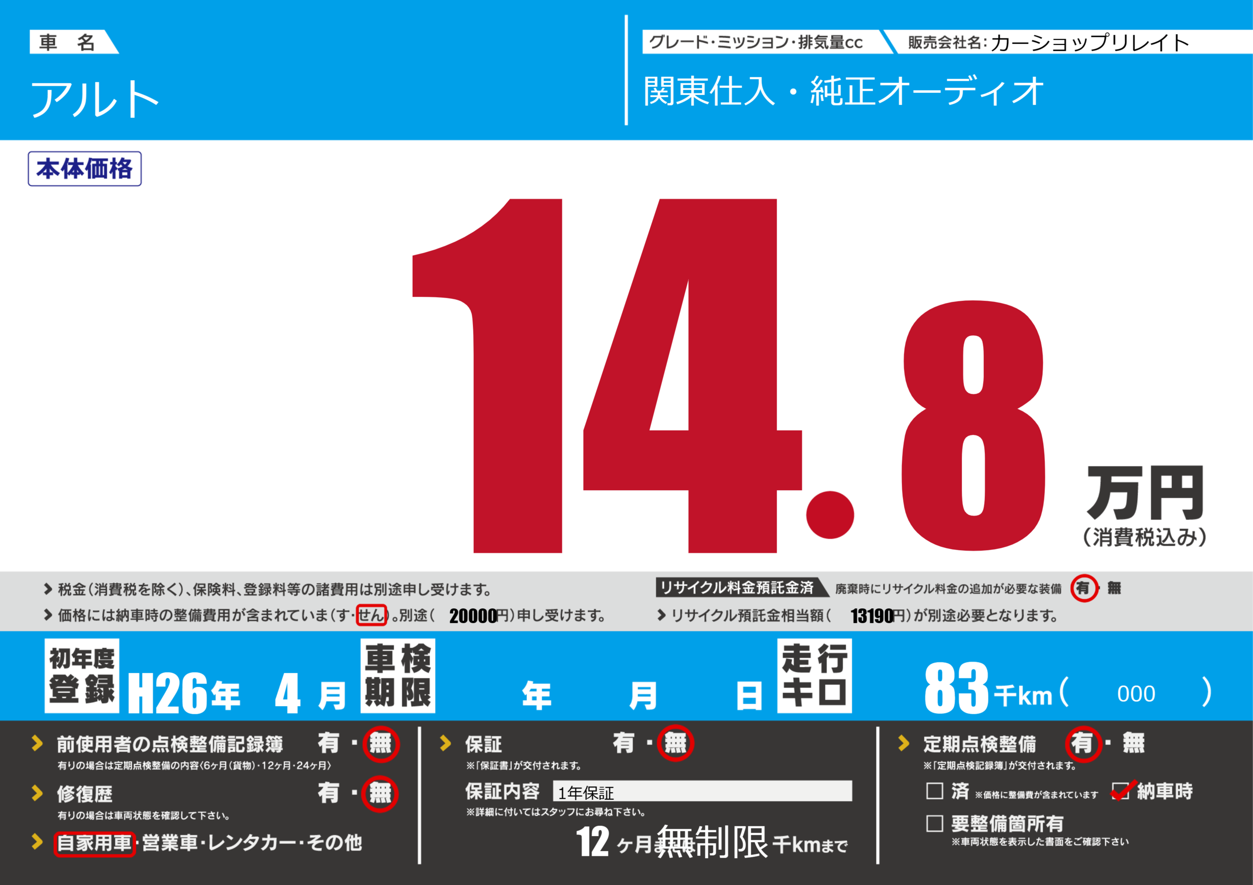 | 定期点検整備 | 定期点検整備あり 納車時あり | ||