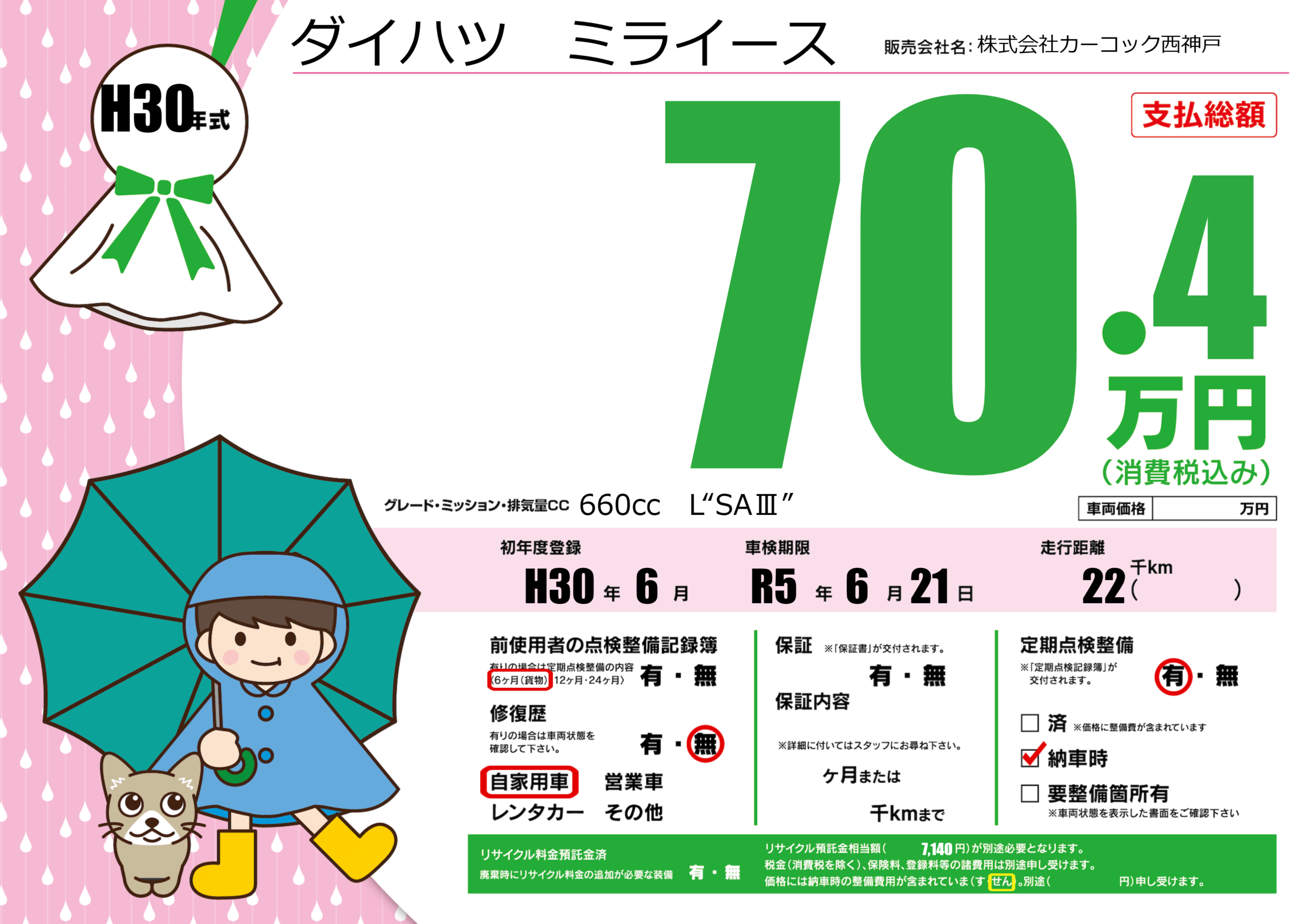 | 定期点検整備 | 定期点検整備あり 納車時あり | ||