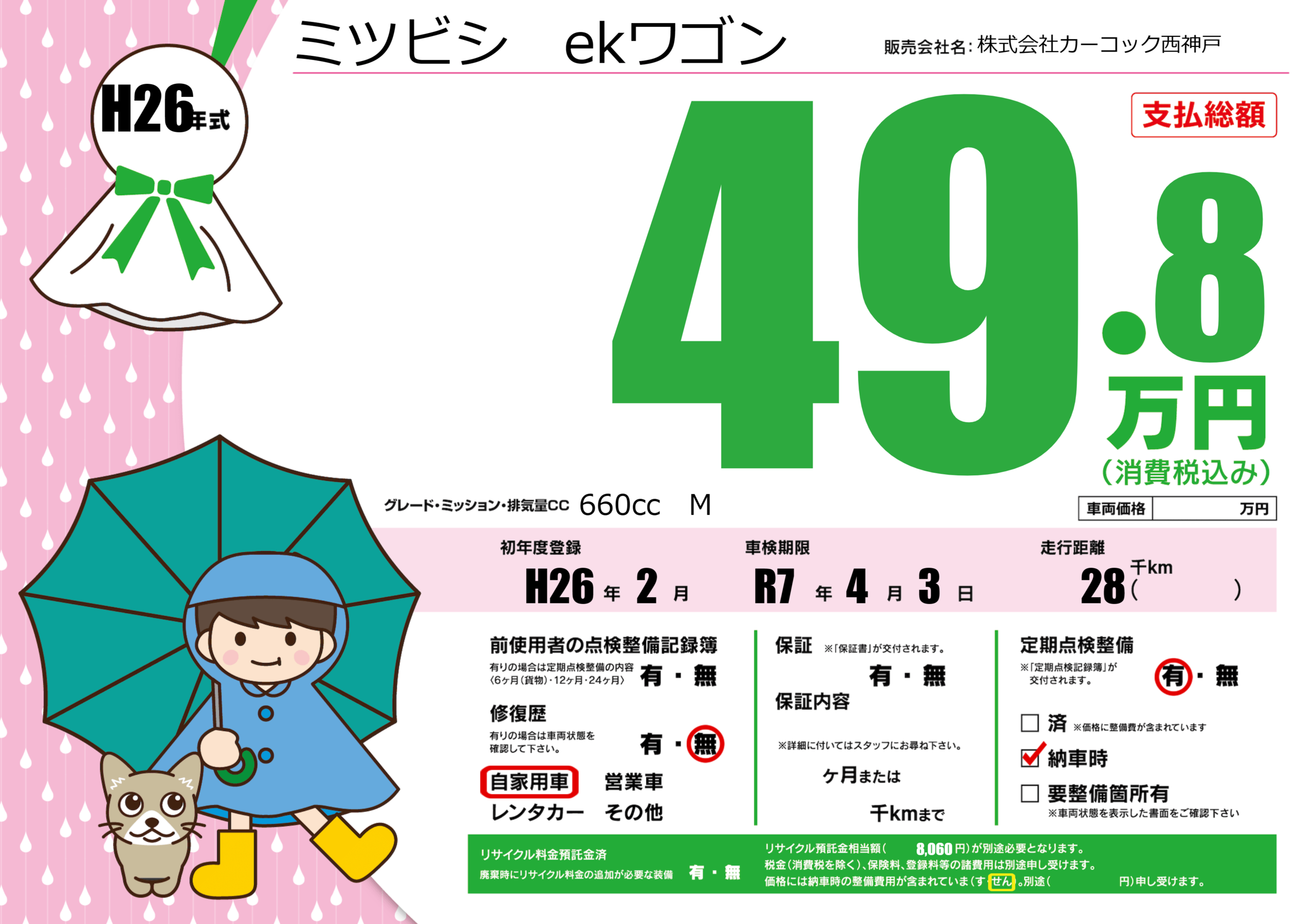 | 車名 | ミツビシ ekワゴン | グレード ミッション 排気量 |