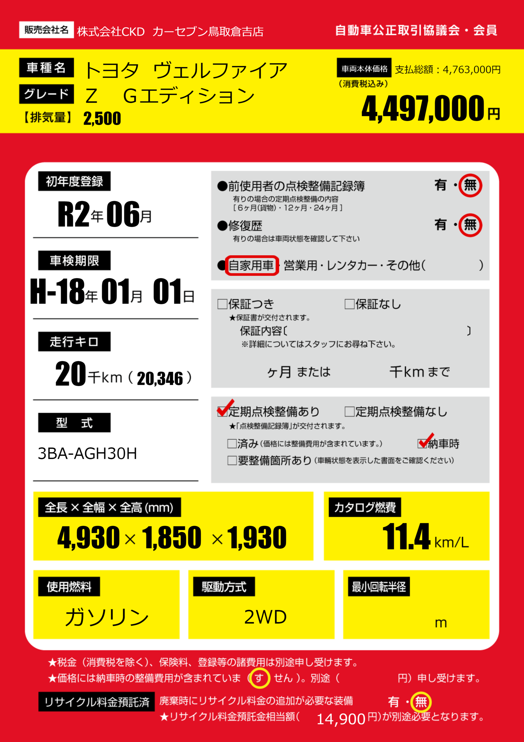 | 車名 | トヨタ ヴェルファイア | グレード ミッション 排気量 |