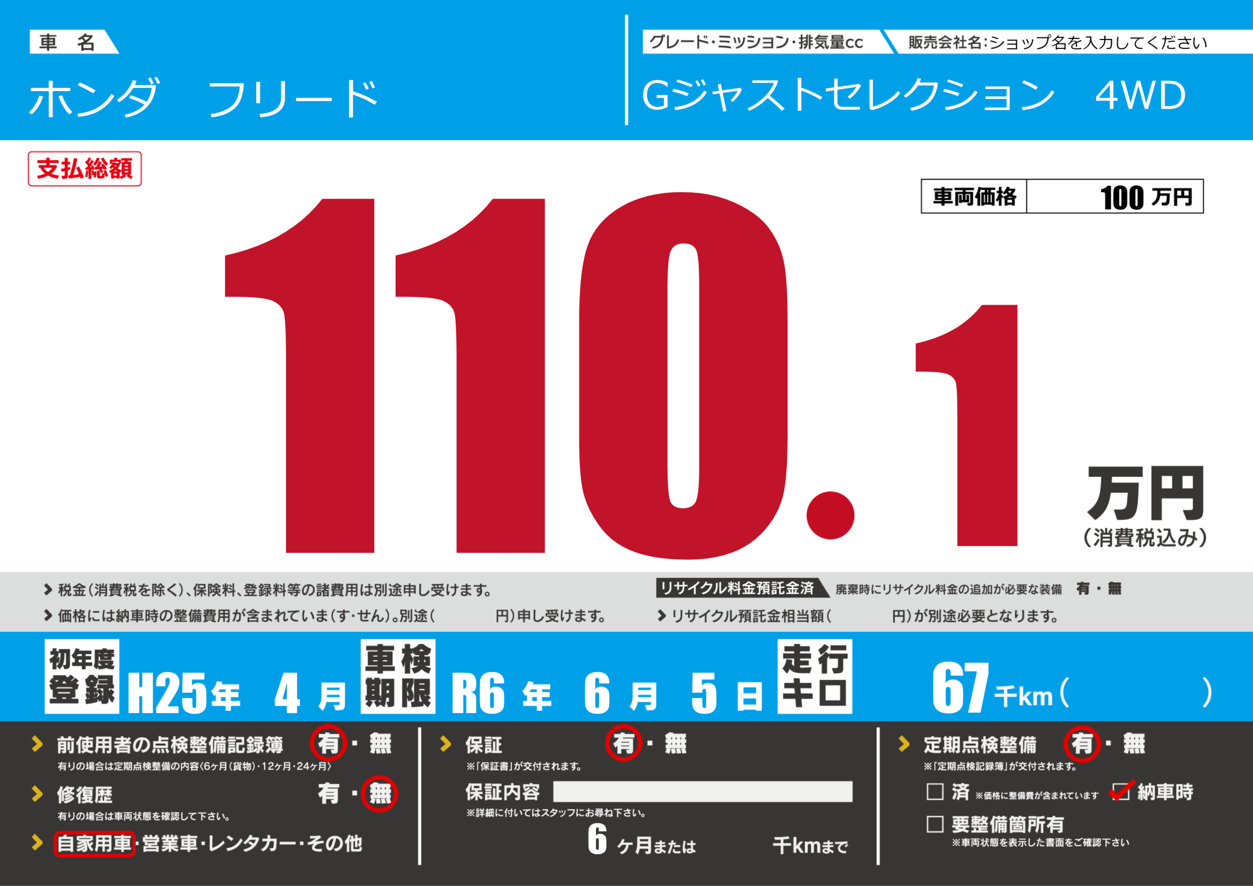 | 定期点検整備 | 定期点検整備あり 納車時あり | ||