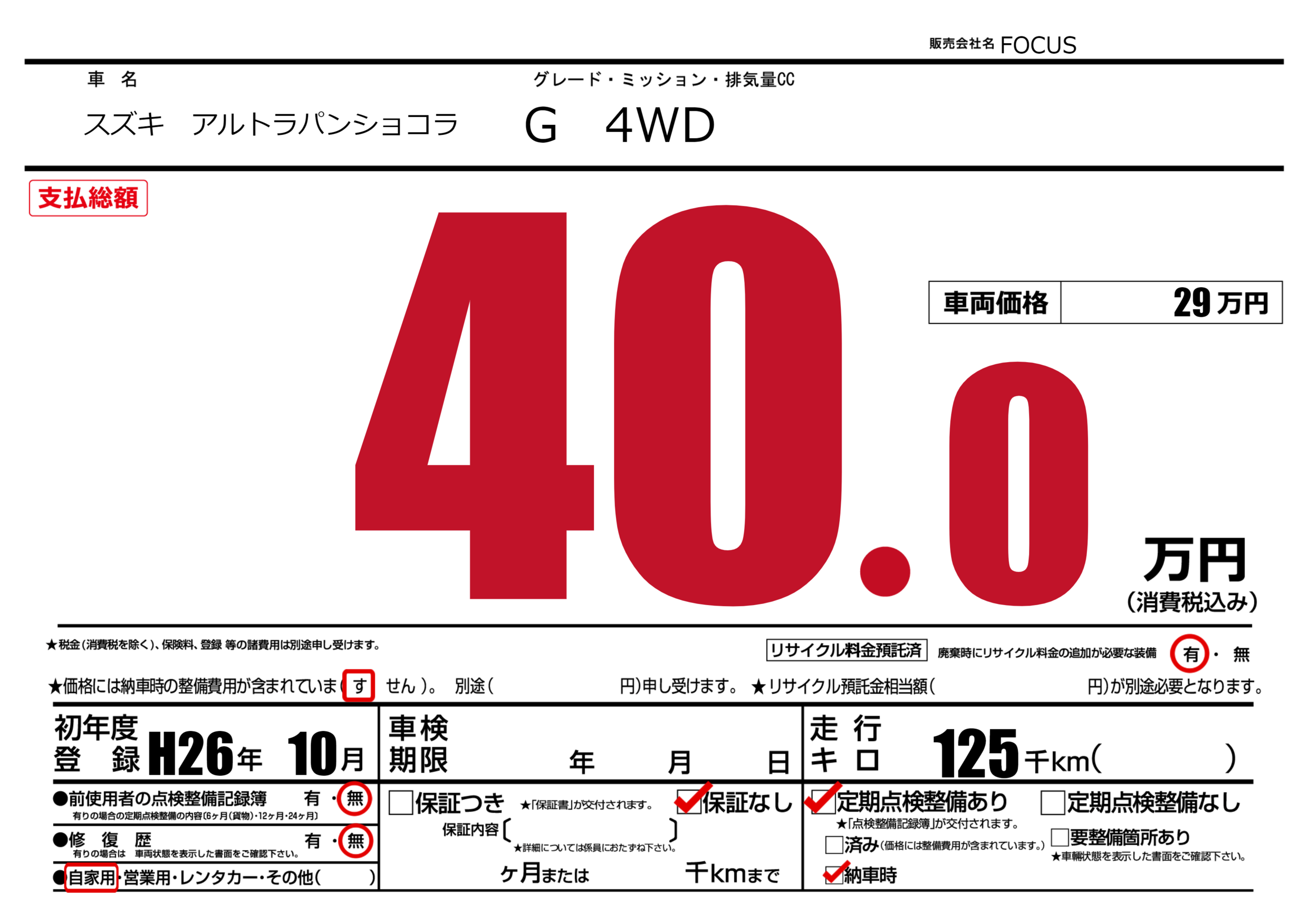 | 定期点検整備 | 定期点検整備あり 納車時あり | ||