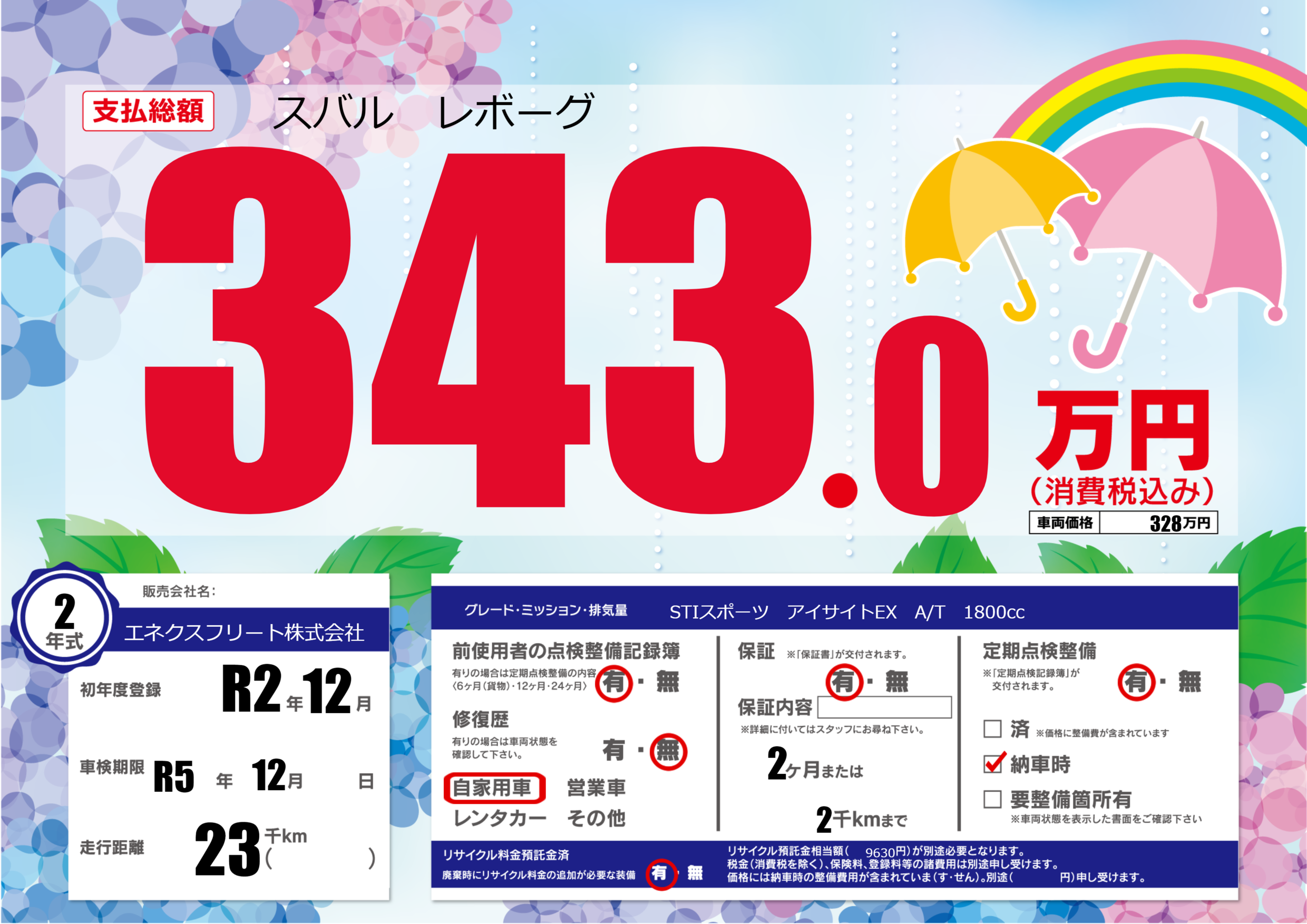 | 車名 | スバル レボーグ | グレード ミッション 排気量 |