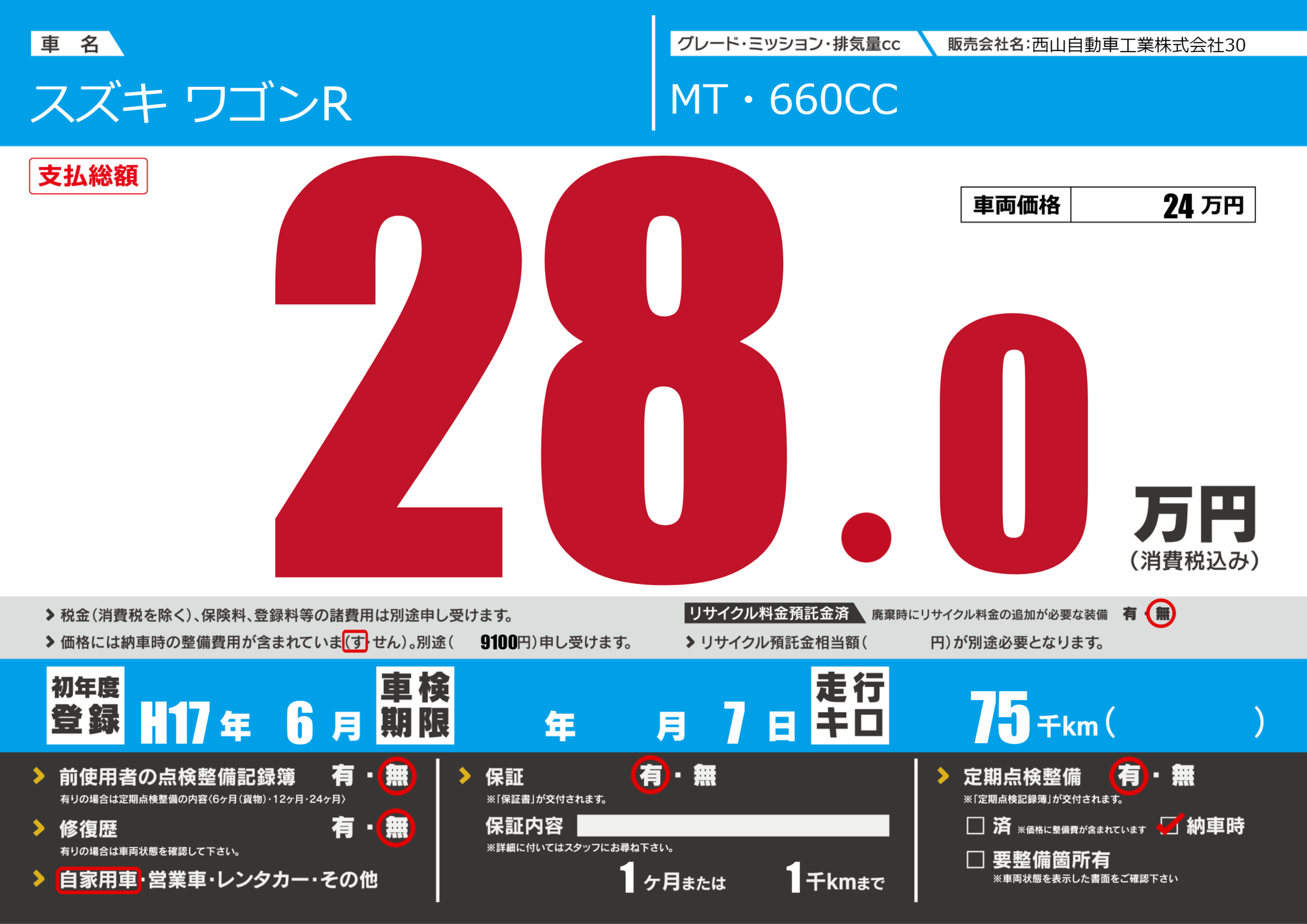 | 走行キロ | 7.5万km | 初年度登録 | H17年6月 |