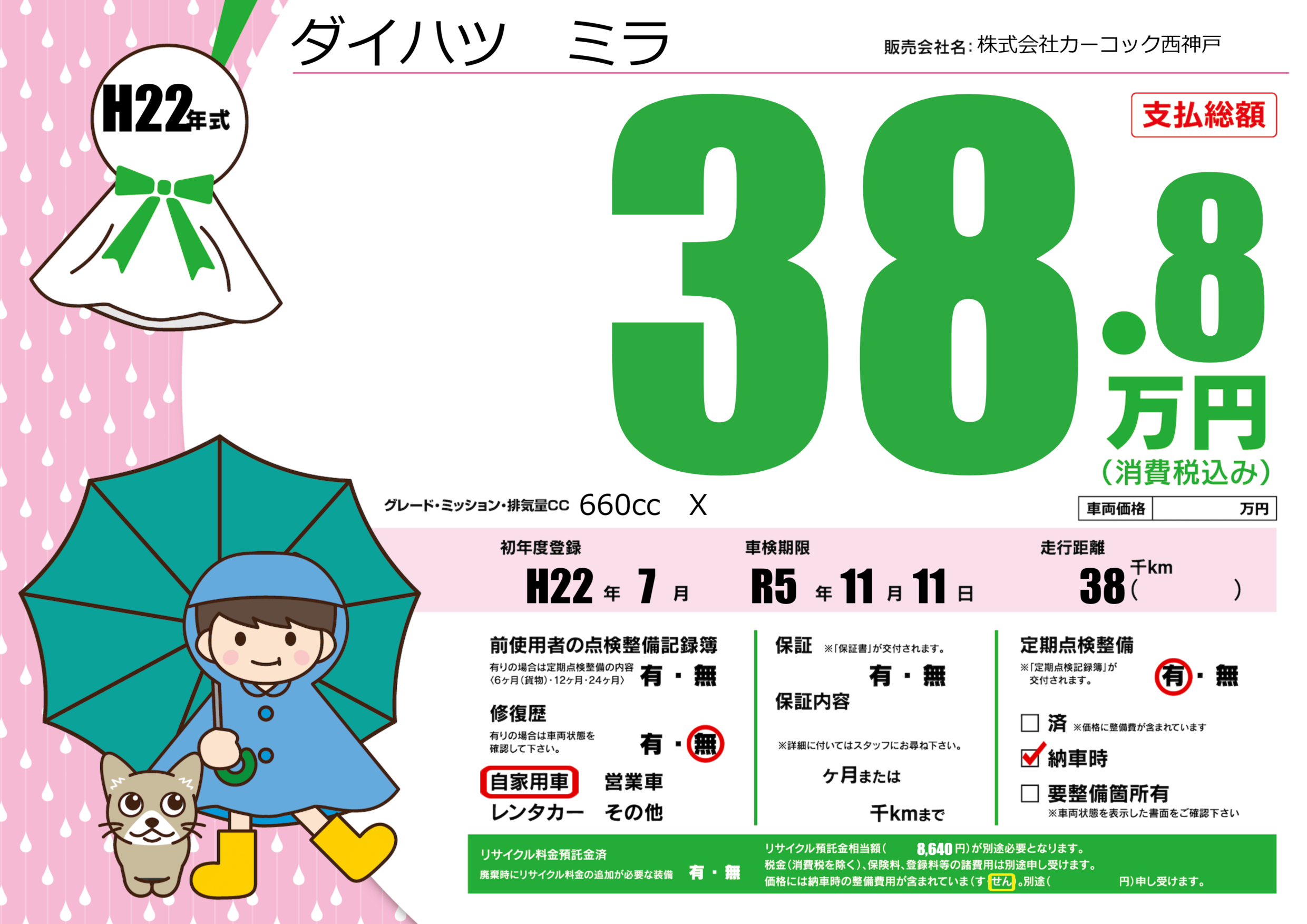 | 走行キロ | 3.8万km | 初年度登録 | H22年7月 |