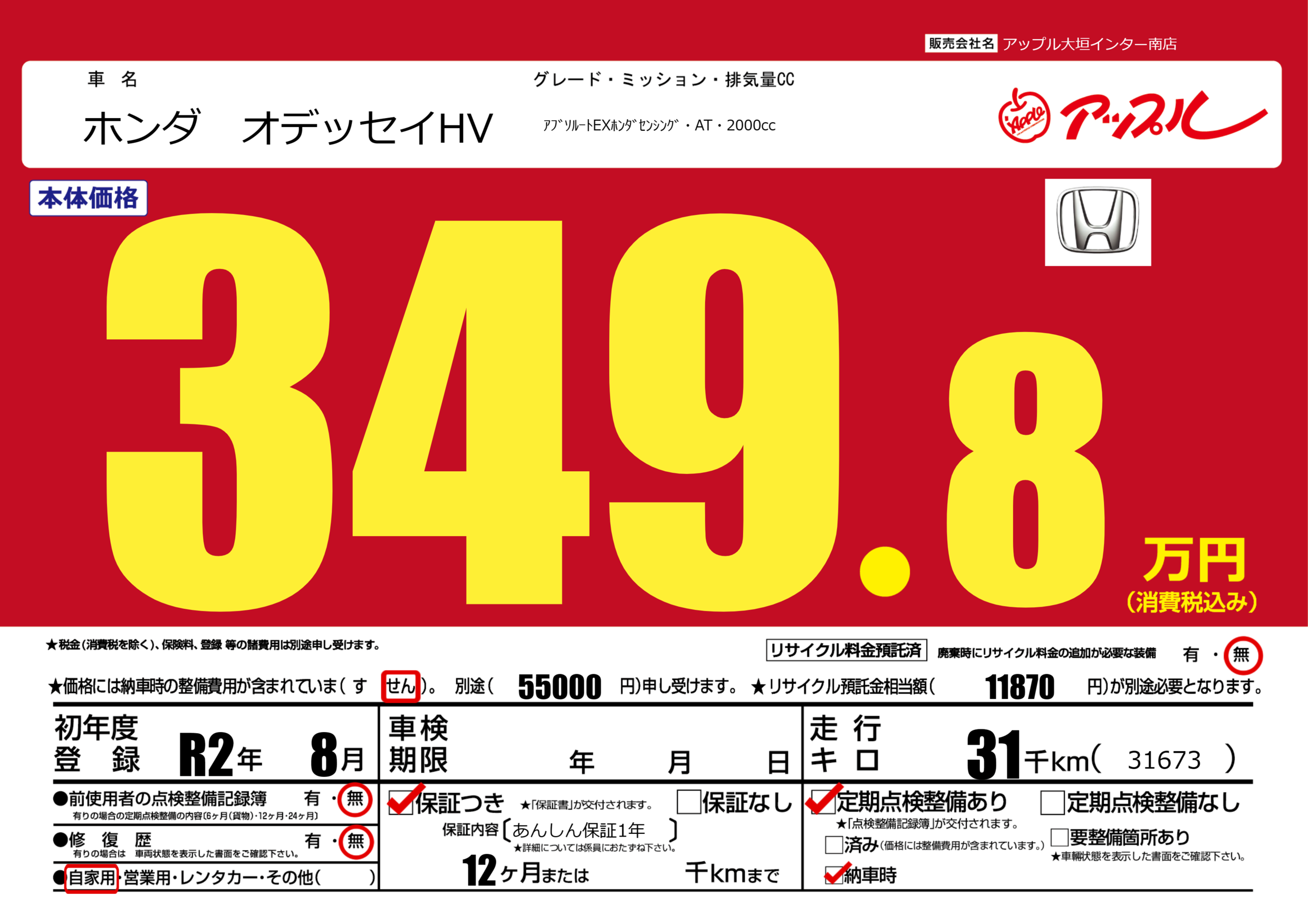 保証付き 保証内容(あんしん保証1年) 12ヶ月または()千kmまで |