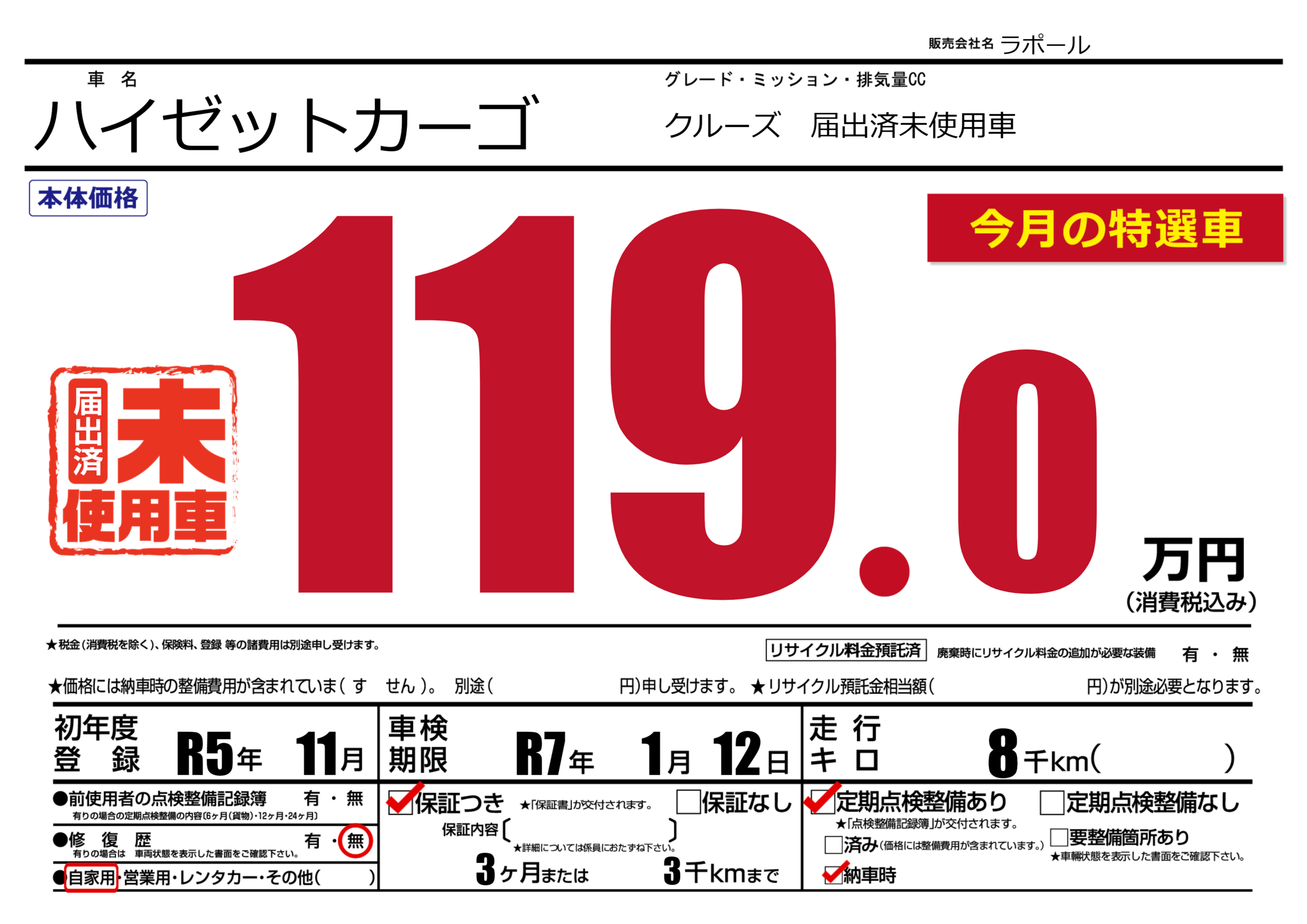 | 走行キロ | 0.8万km | 初年度登録 | R5年11月 |