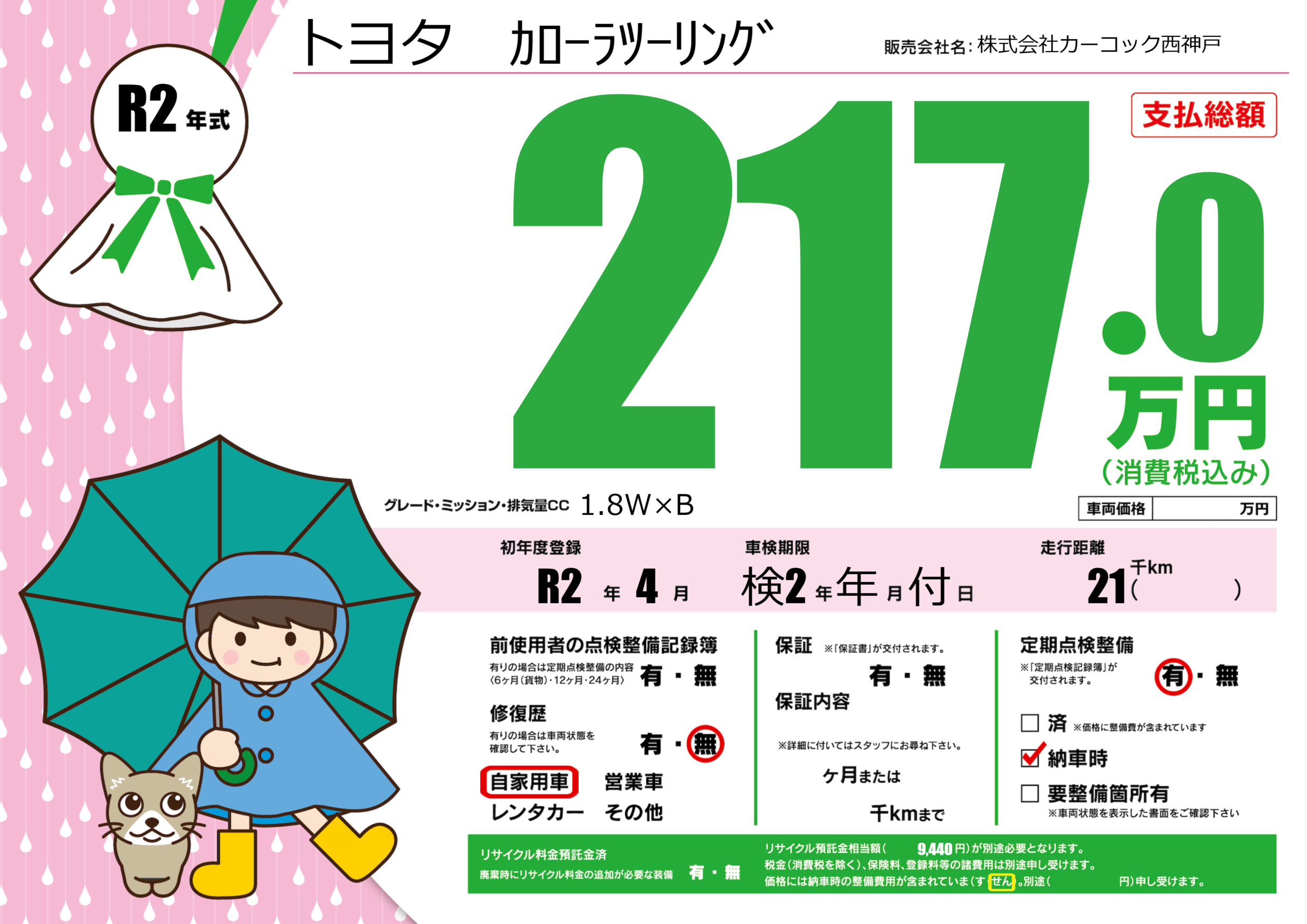 | 車名 | トヨタ カローラツーリング | グレード ミッション 排気量 |