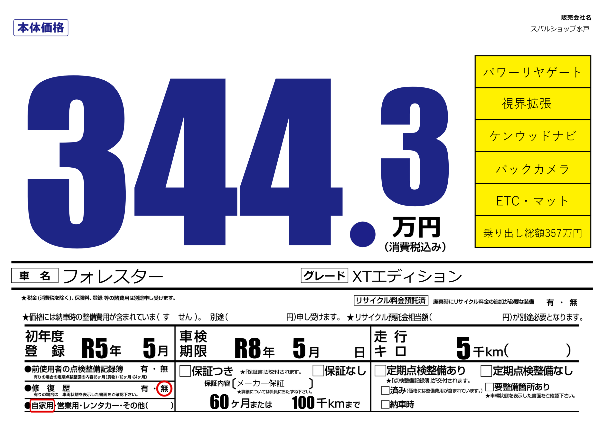 | 車名 | フォレスター | グレード ミッション 排気量 |