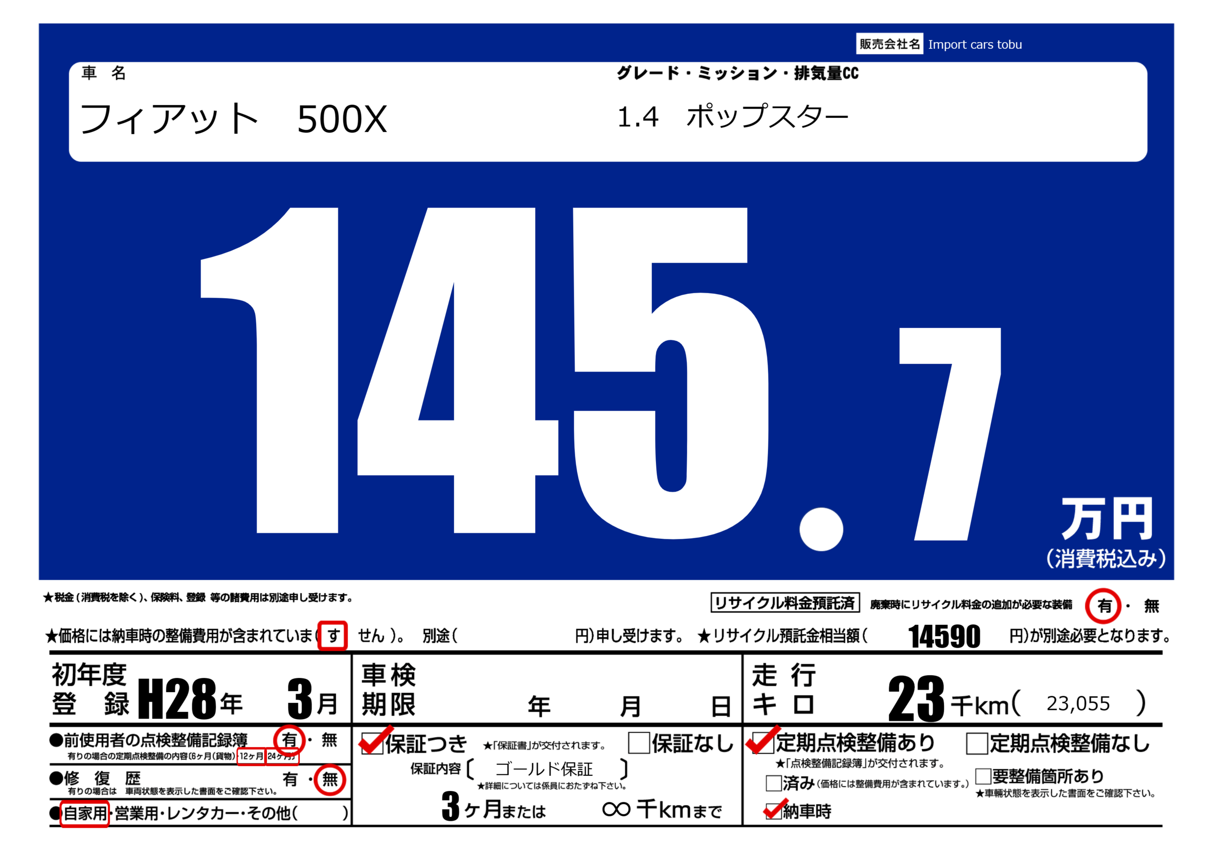 | 車名 | フィアット 500X | グレード ミッション 排気量 |