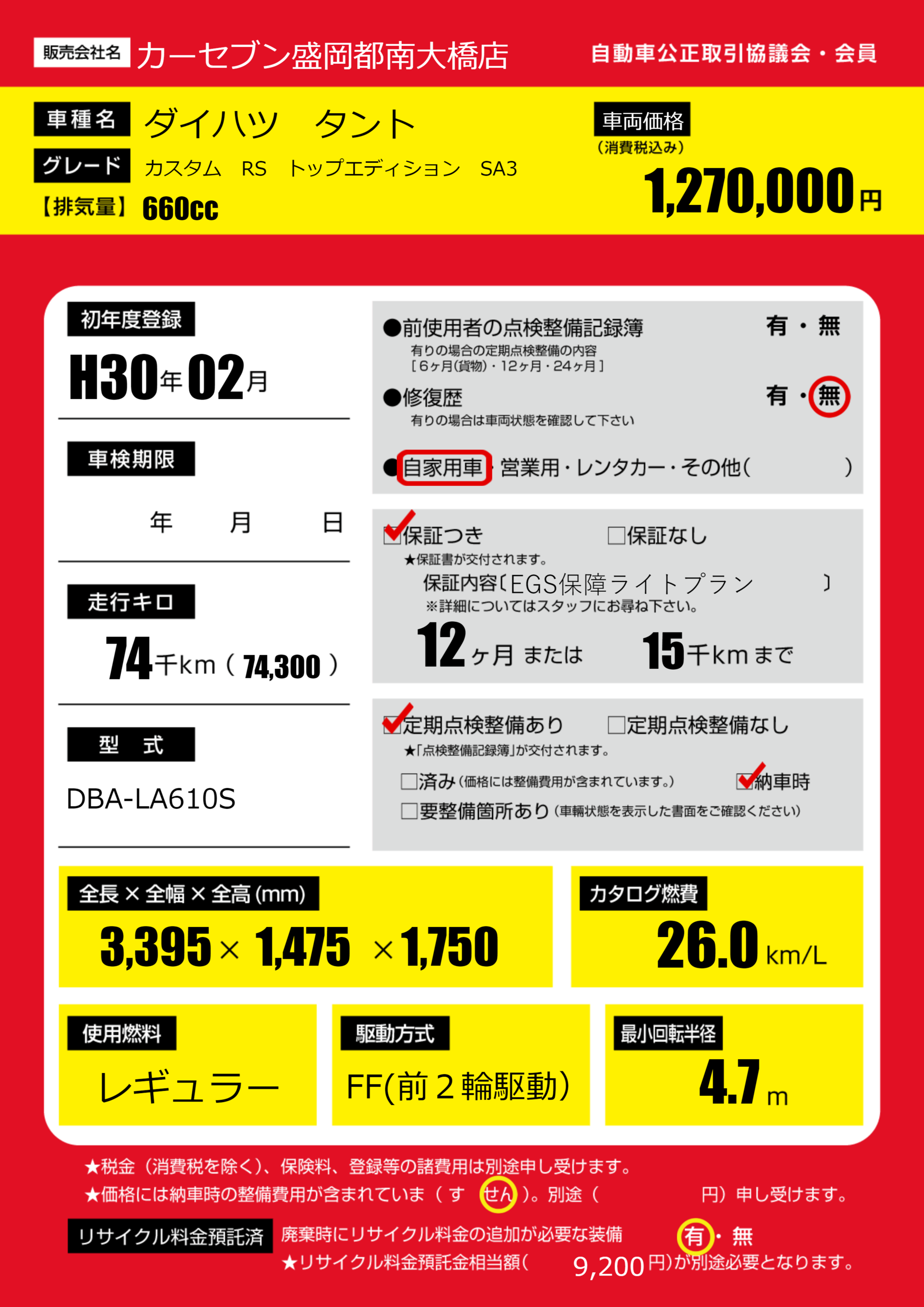 | 車名 | ダイハツ タント | グレード ミッション 排気量 |