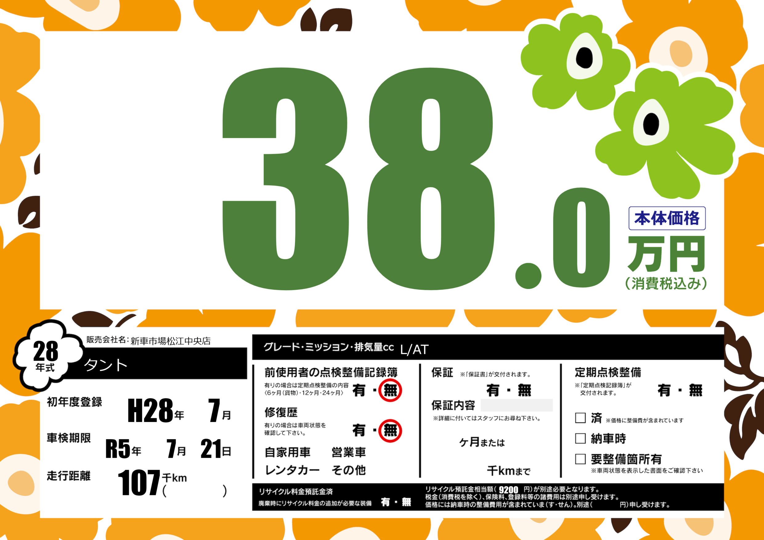 | 走行キロ | 10.7万km | 初年度登録 | H28年7月 |