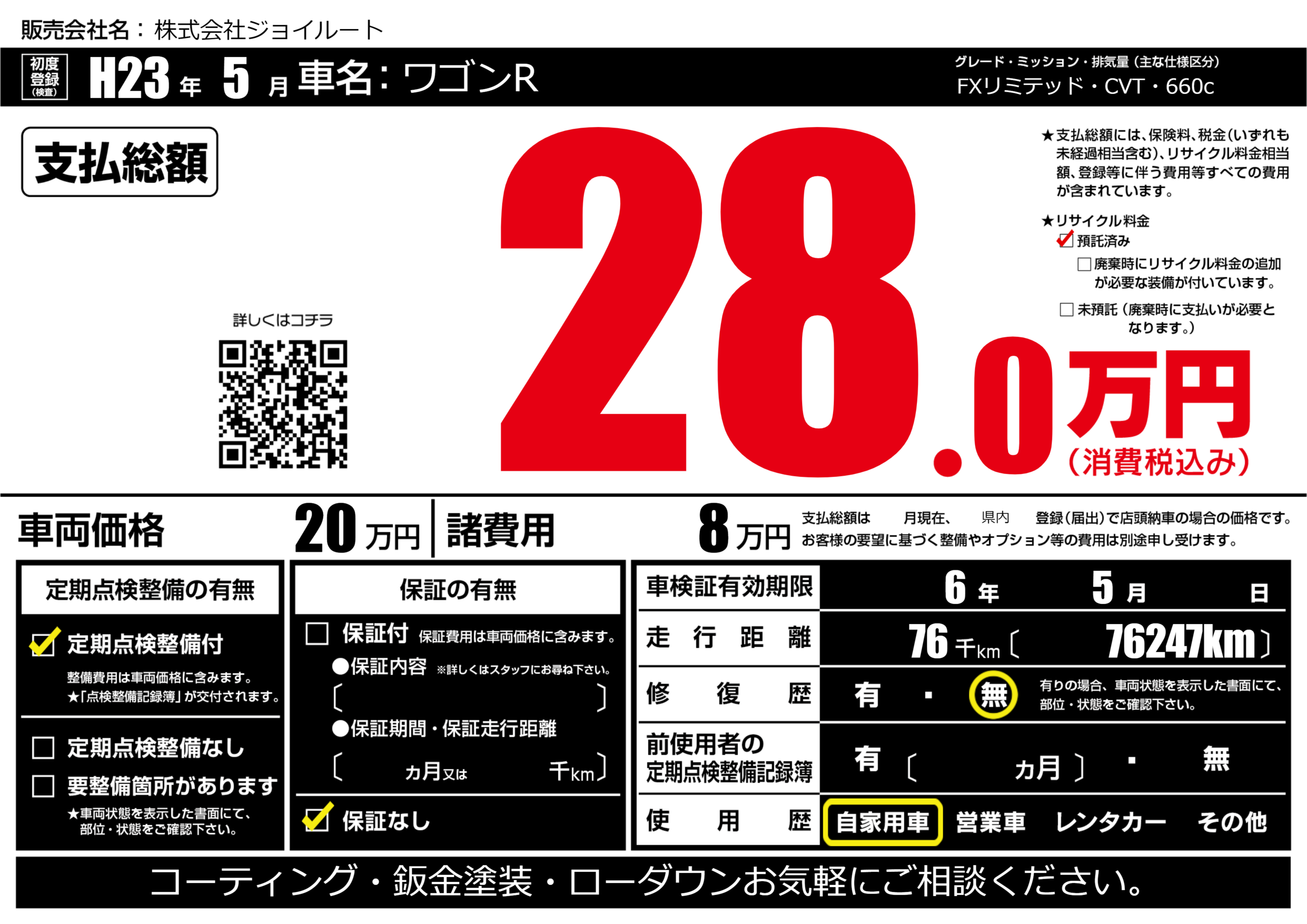 | 走行キロ | 7.6万km | 初年度登録 | H23年5月 |