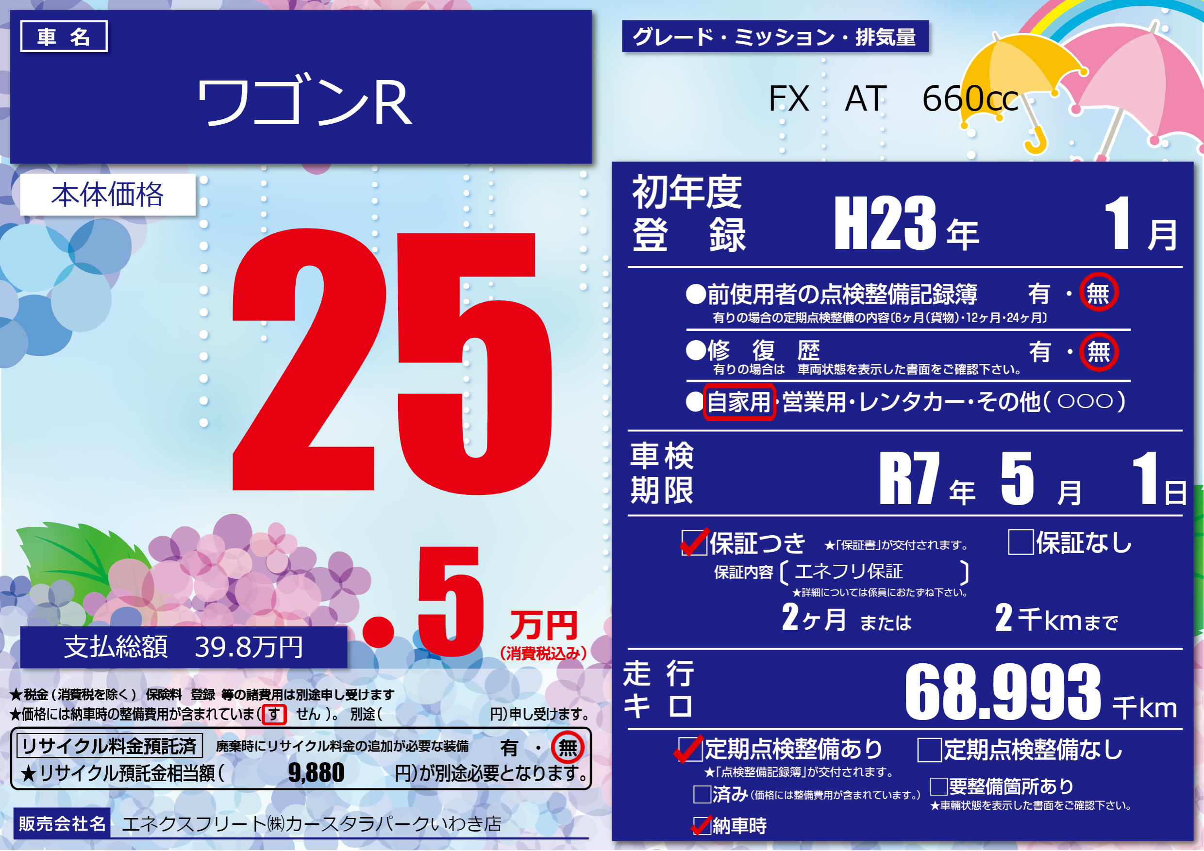 | 車名 | ワゴンR | グレード ミッション 排気量 |
