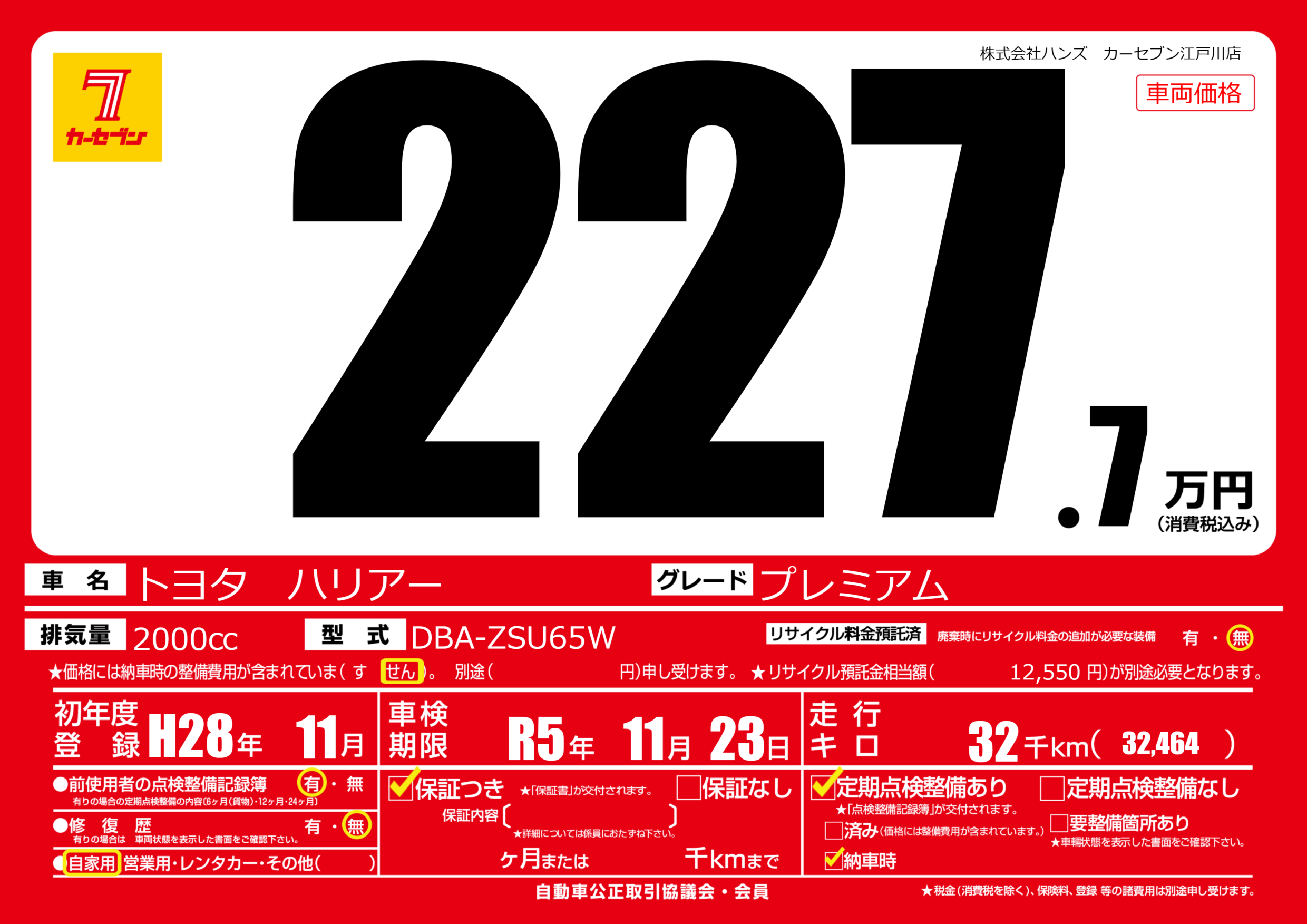 | 車名 | トヨタ ハリアー | グレード ミッション 排気量 |