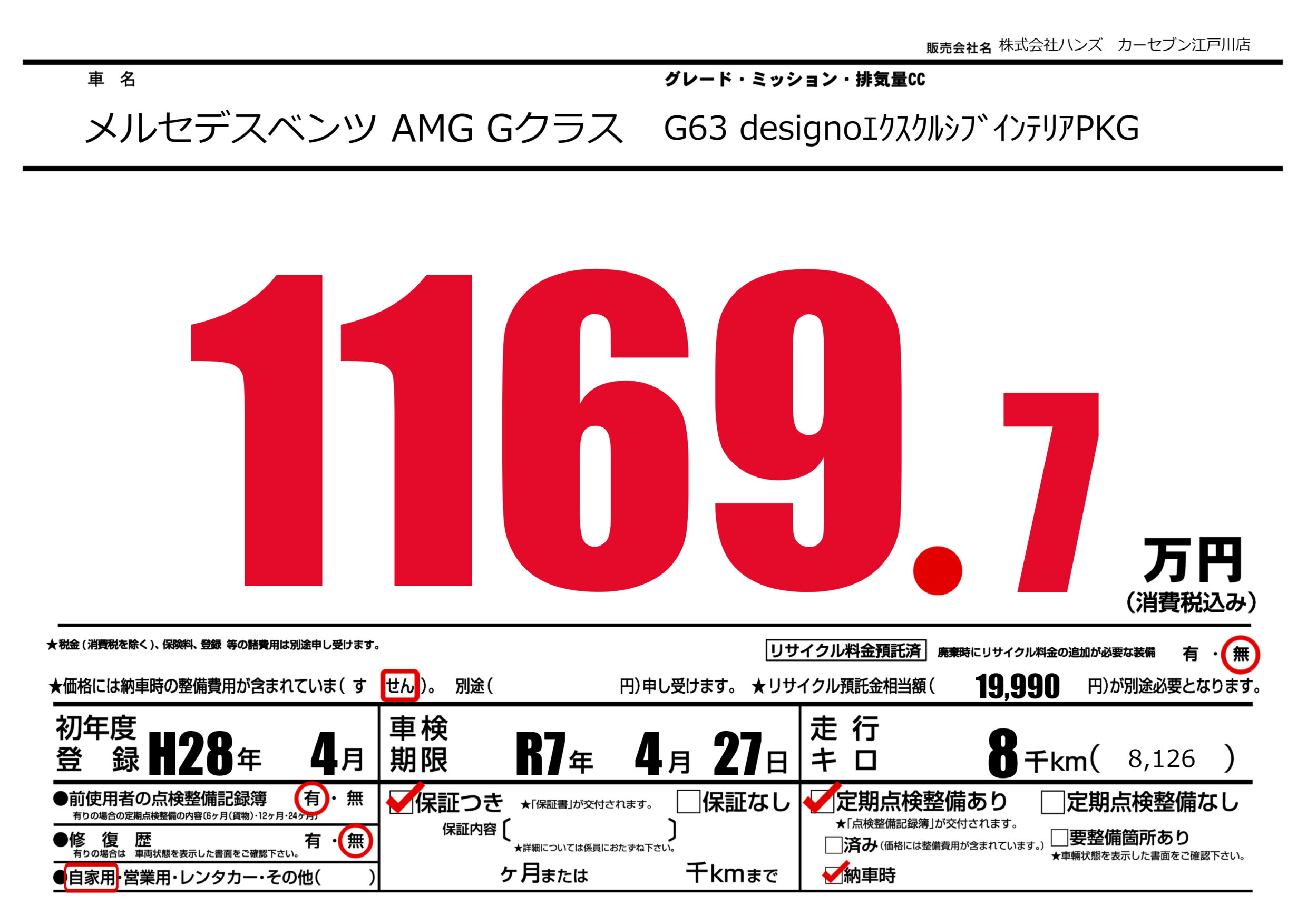 | 車名 | メルセデスベンツ AMG Gクラス | グレード ミッション 排気量 |
