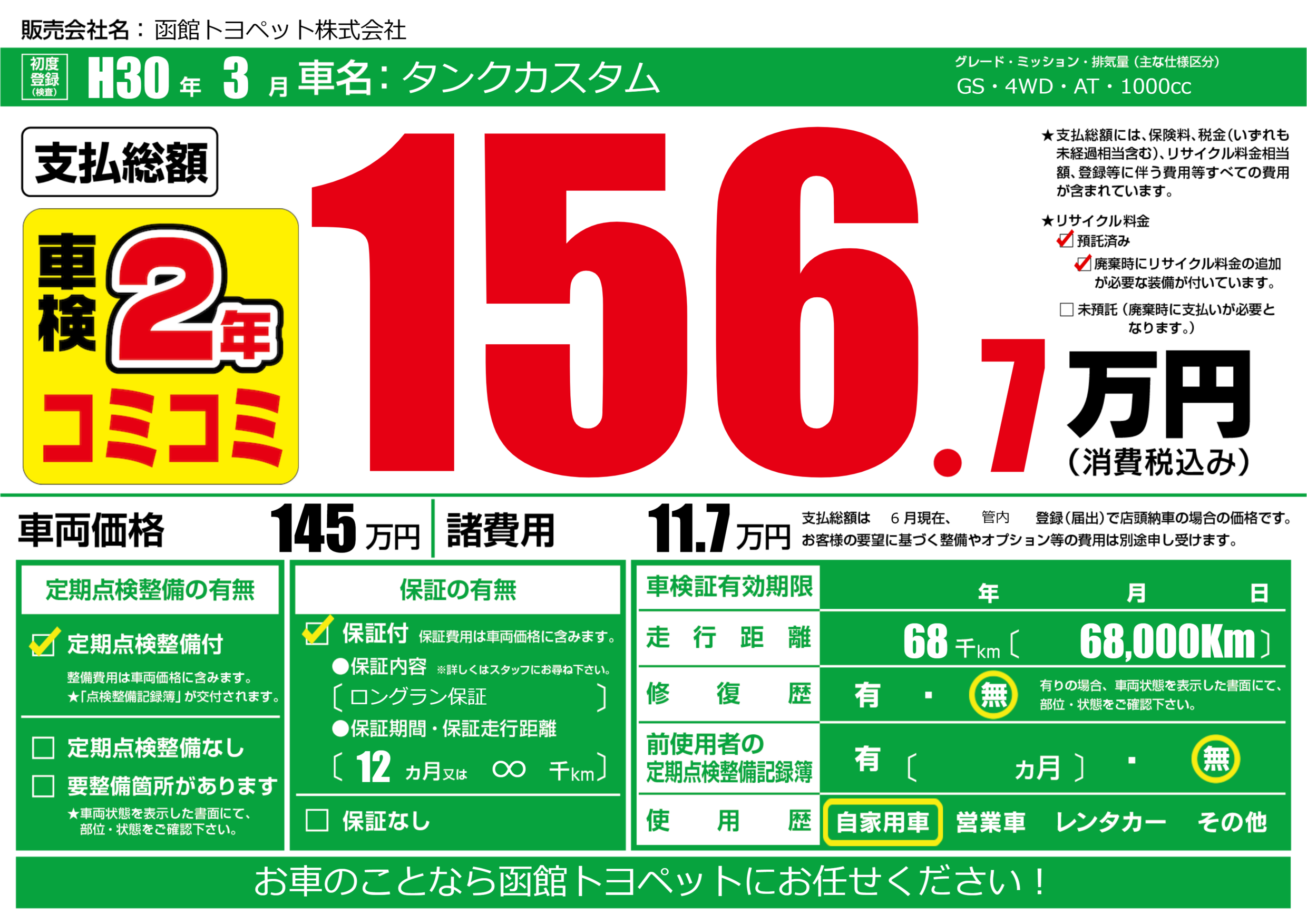 | 車名 | タンクカスタム | グレード ミッション 排気量 |