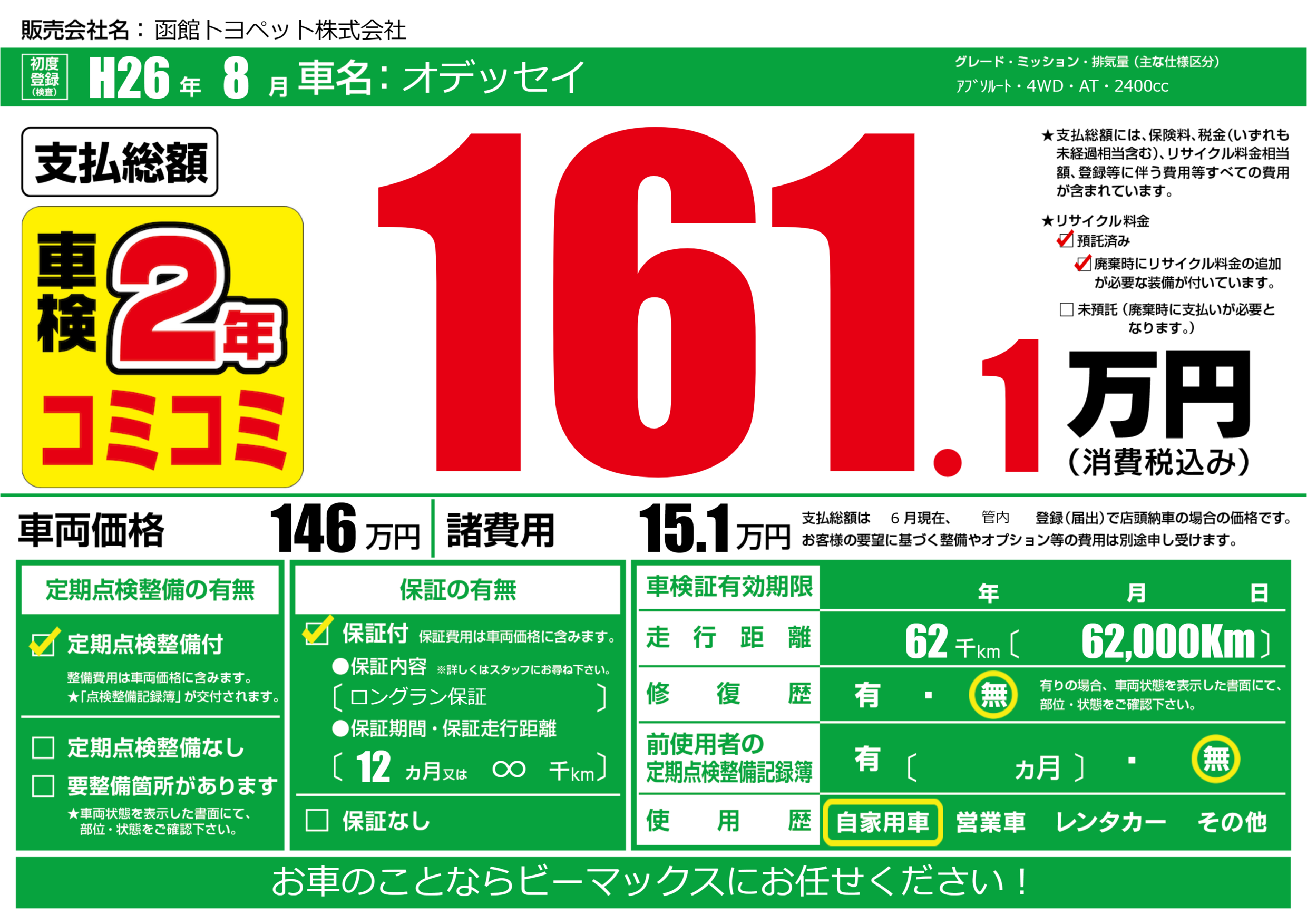 | 走行キロ | 6.2万km | 初年度登録 | H26年8月 |