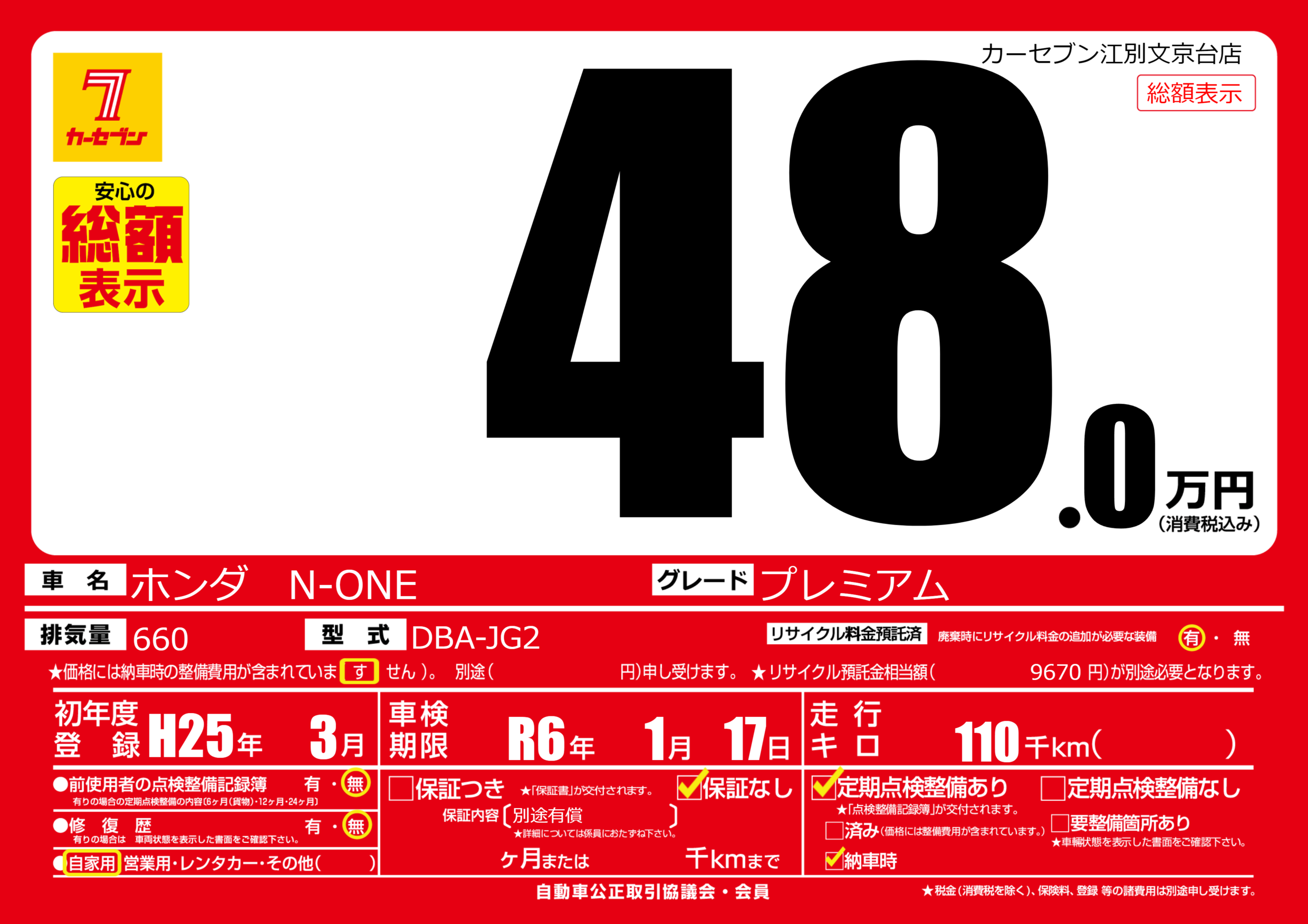 | 車名 | ホンダ N-ONE | グレード ミッション 排気量 |