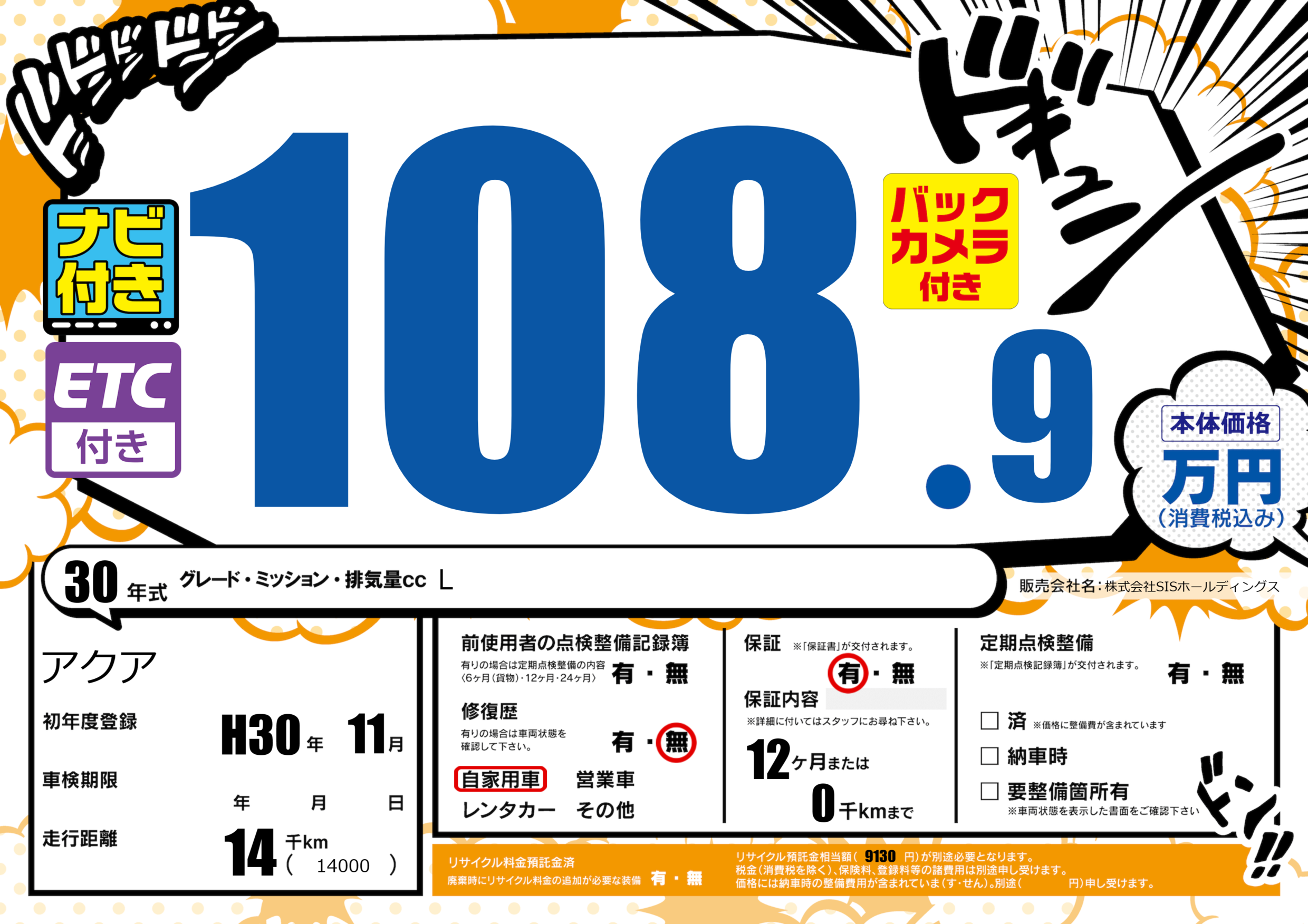 保証付き 保証内容(---) 12ヶ月または(0)千kmまで |