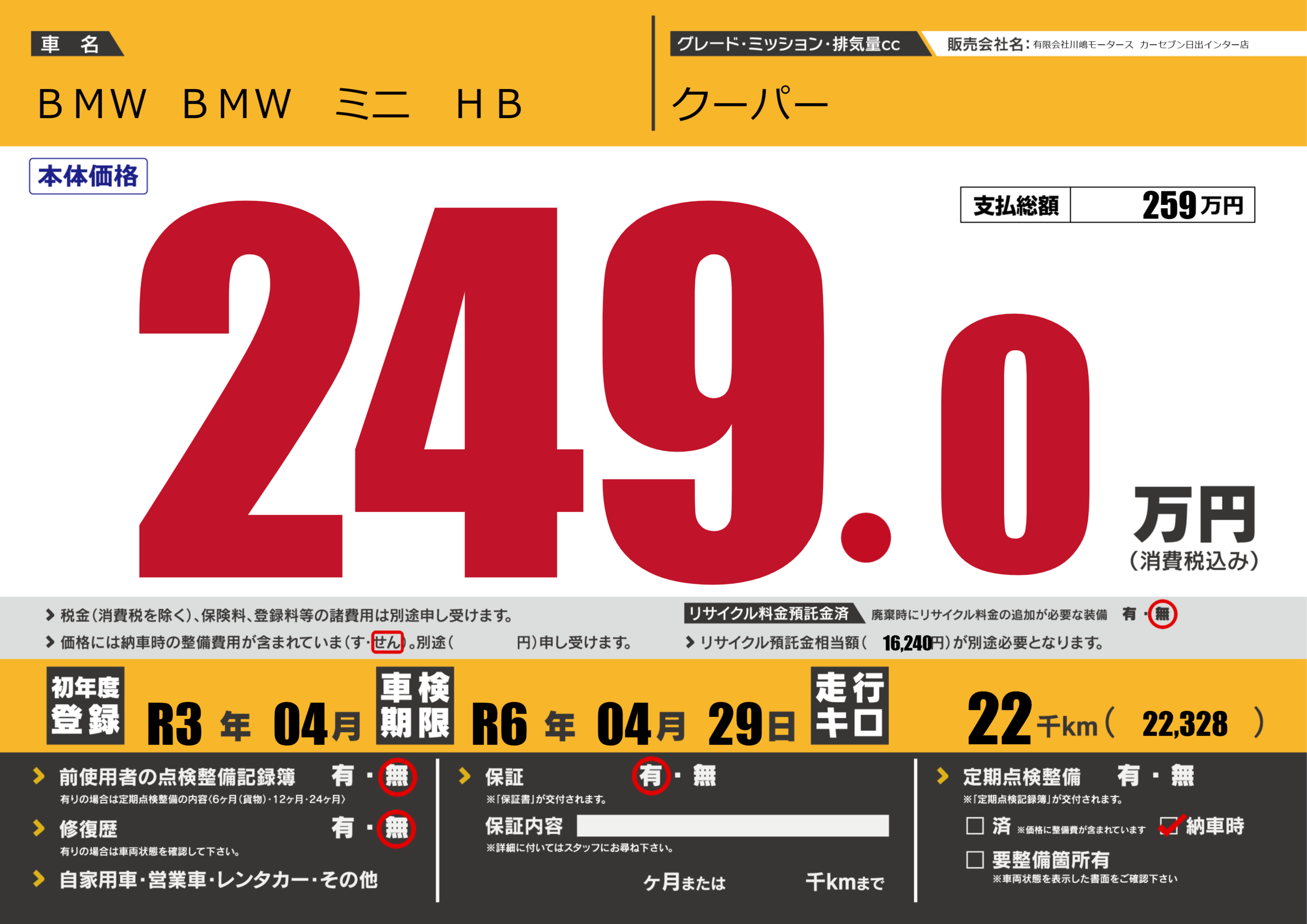 | 車名 | BMW BMW ミニ HB | グレード ミッション 排気量 |