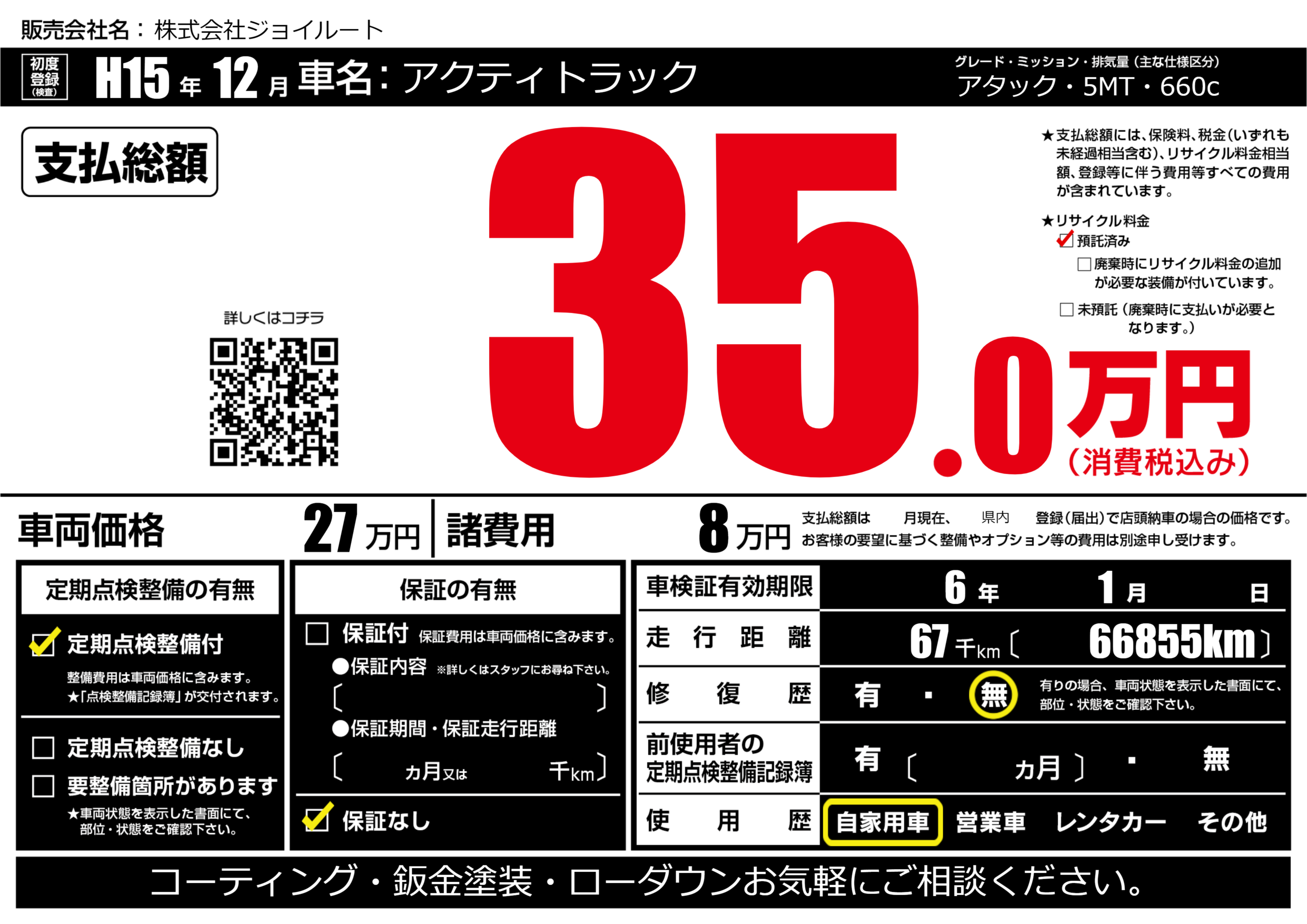 | 走行キロ | 6.7万km | 初年度登録 | H15年12月 |