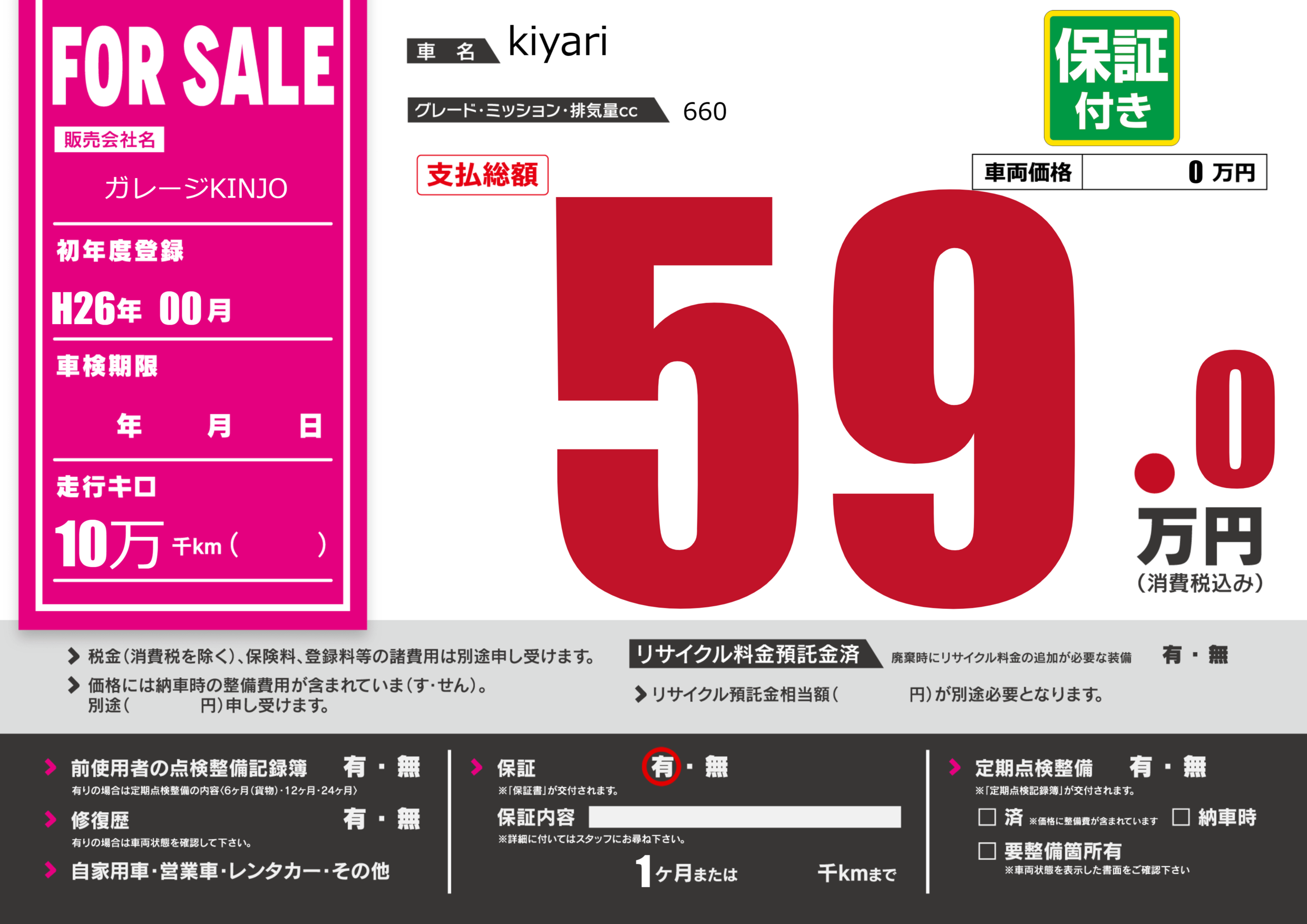 | 車名 | kiyari | グレード ミッション 排気量 |