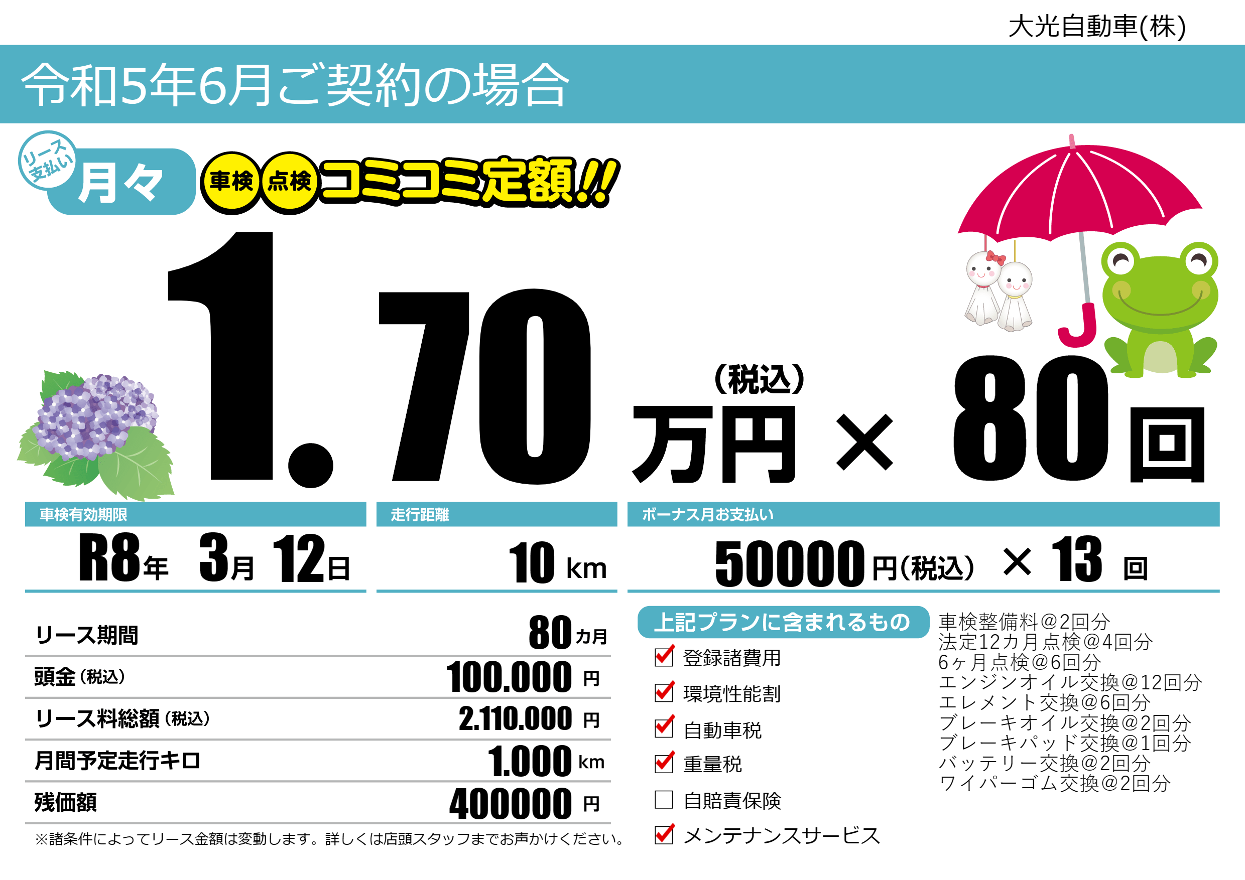 | 車名 | 令和5年6月ご契約の場合 | グレード ミッション 排気量 |