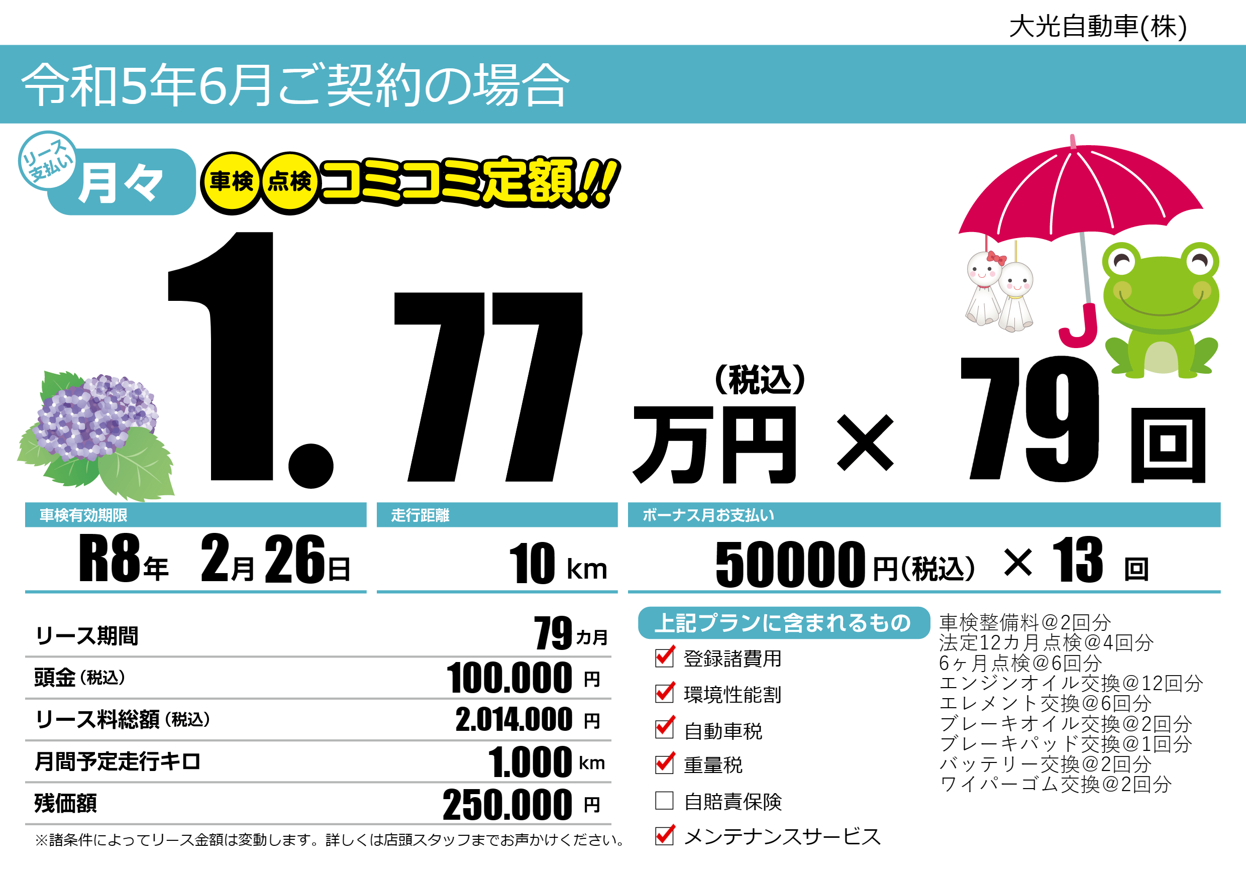 | 車名 | 令和5年6月ご契約の場合 | グレード ミッション 排気量 |