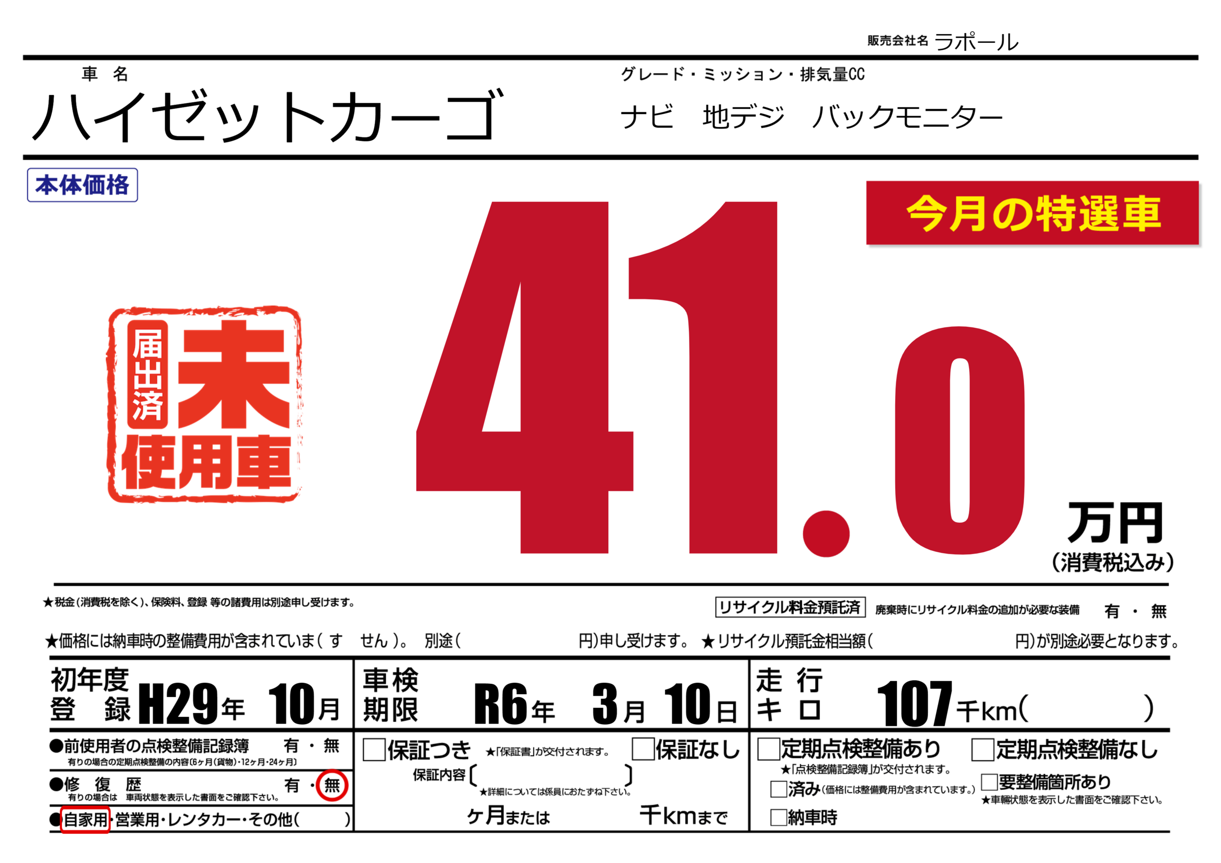 | 走行キロ | 10.7万km | 初年度登録 | H29年10月 |