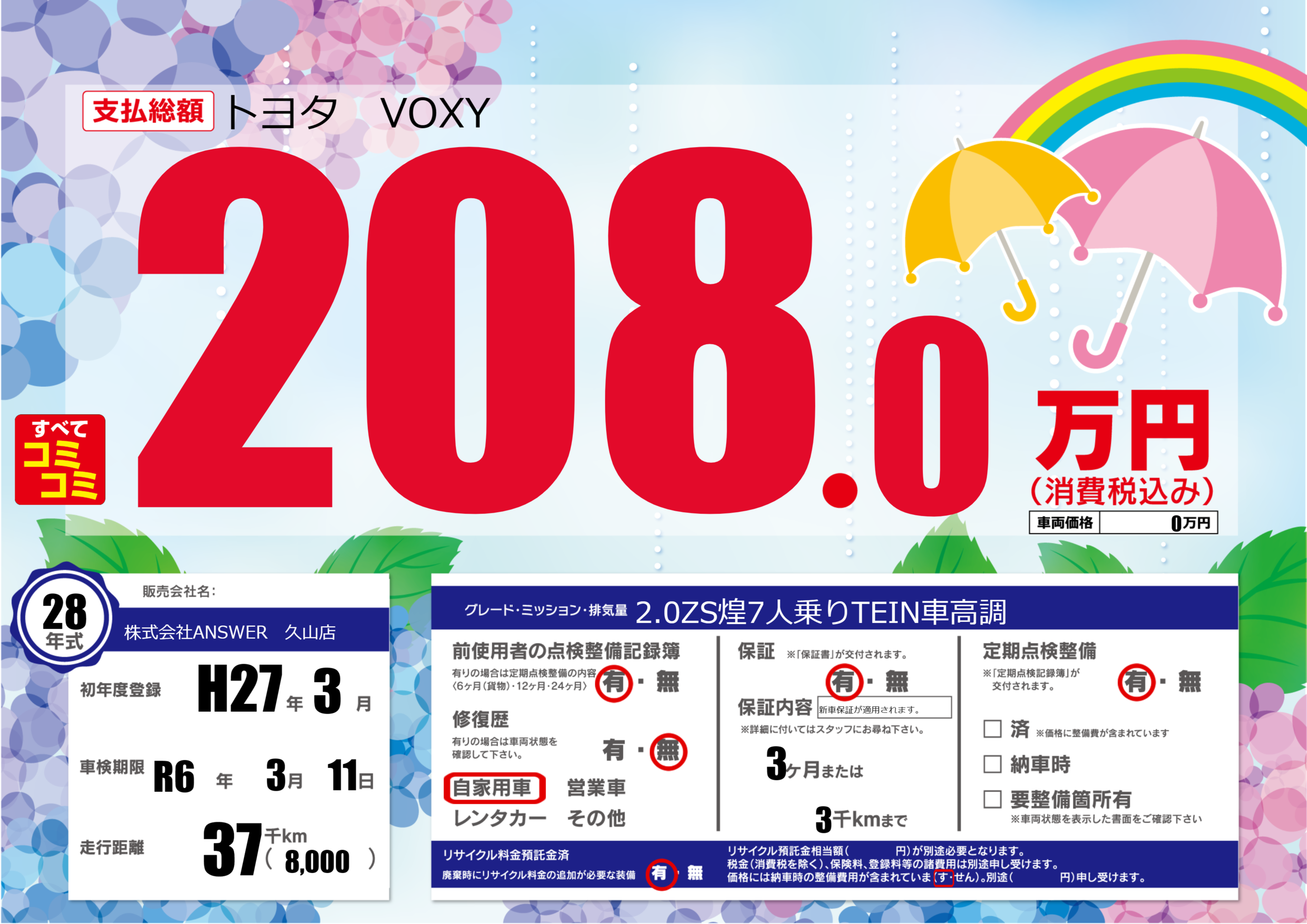 | 走行キロ | 3.7万km | 初年度登録 | H27年3月 |
