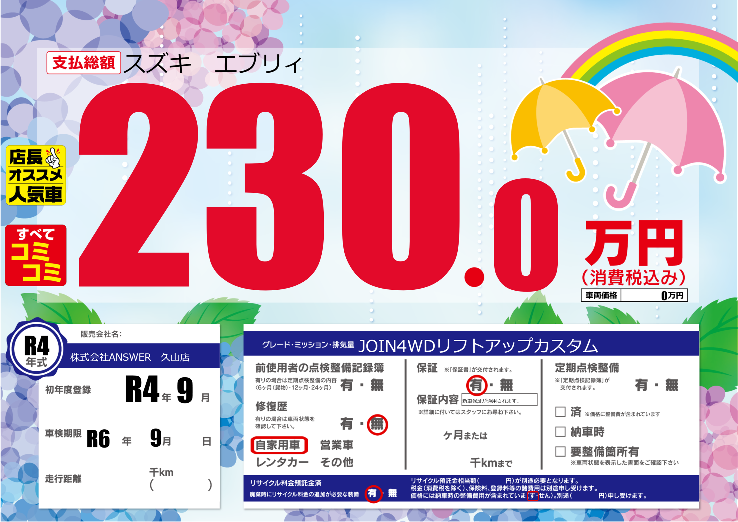 | 車検制限 | R6年 9月 - 日 | ||