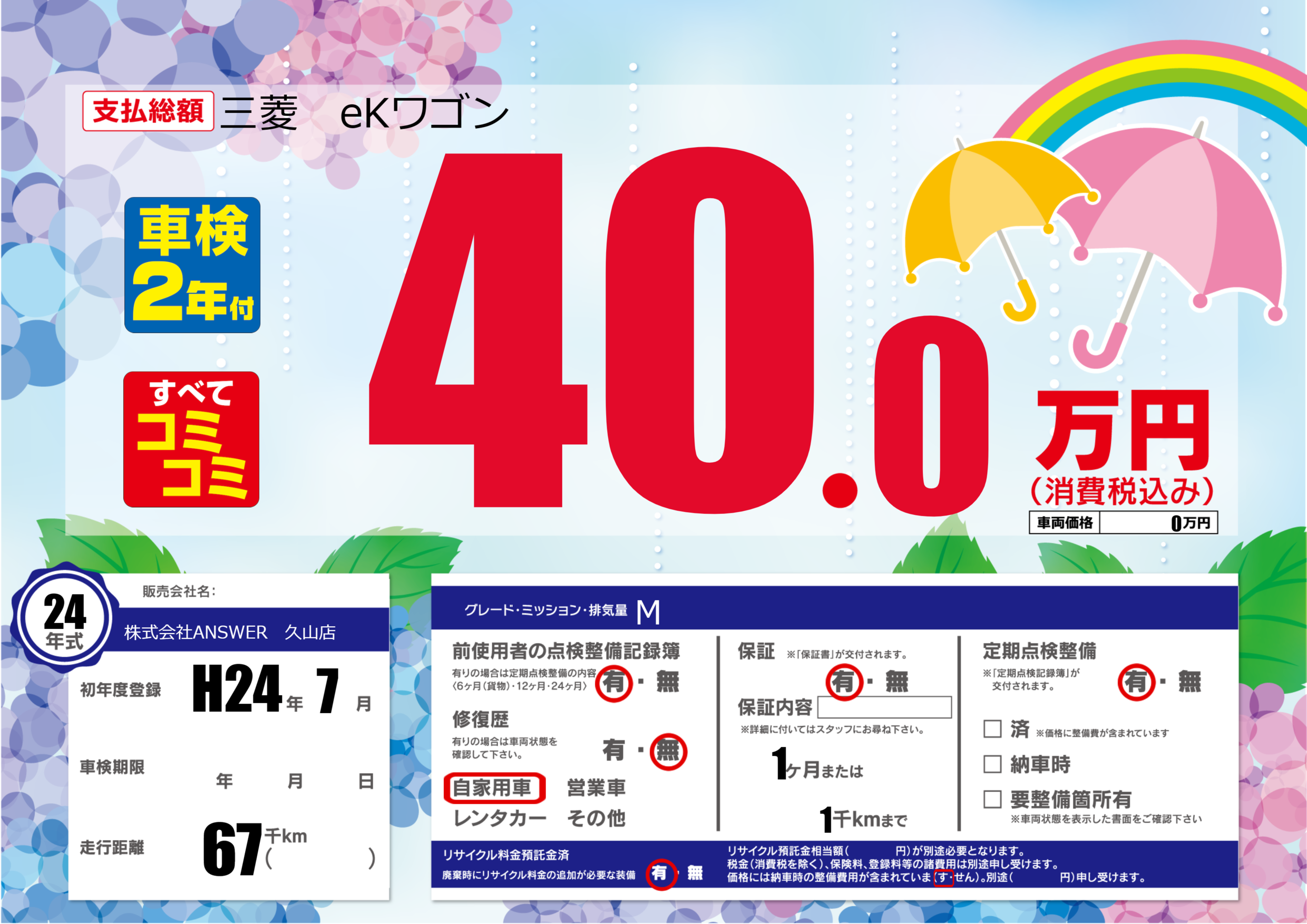 | 走行キロ | 6.7万km | 初年度登録 | H24年7月 |