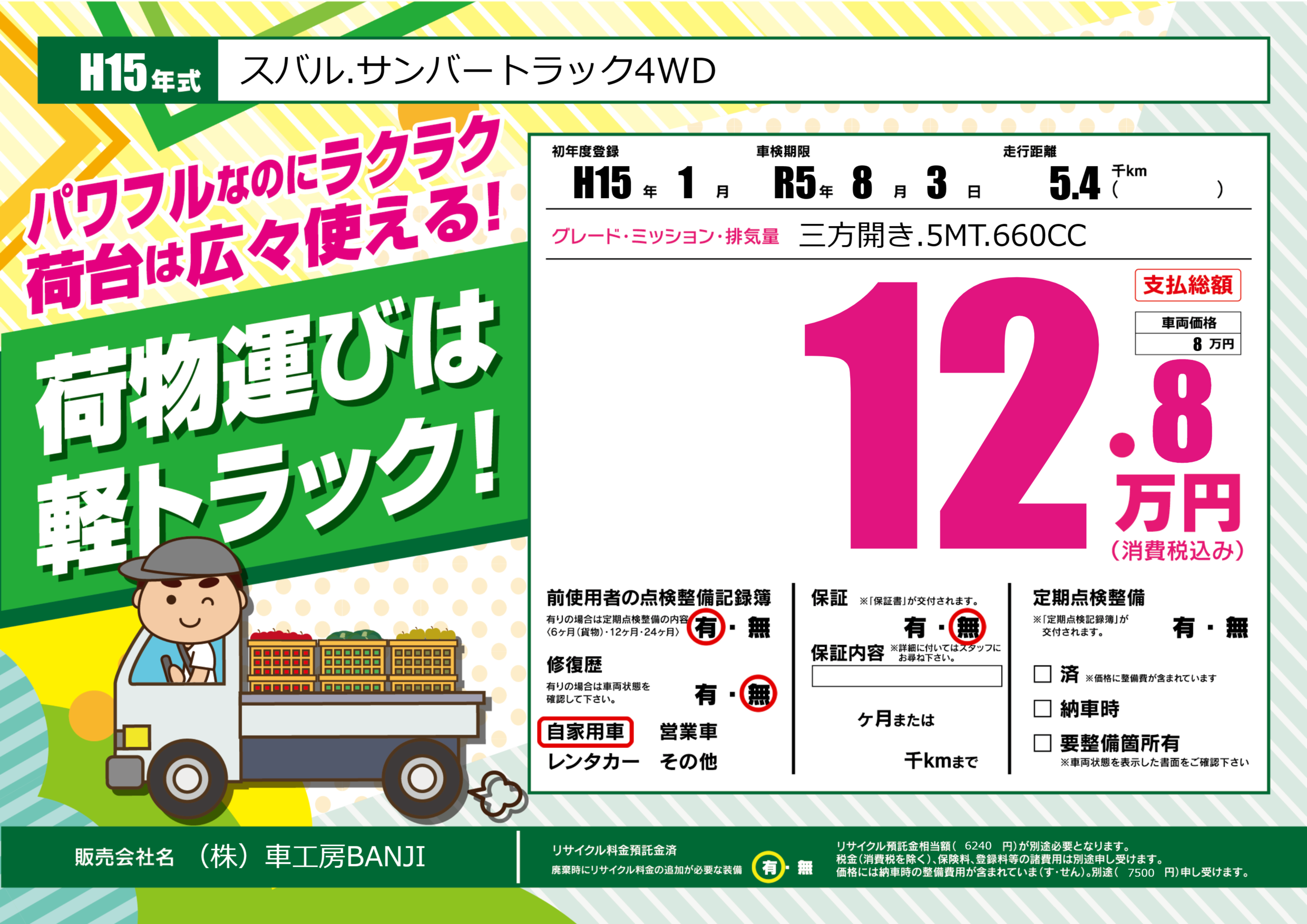 | 車名 | スバル.サンバートラック4WD | グレード ミッション 排気量 |