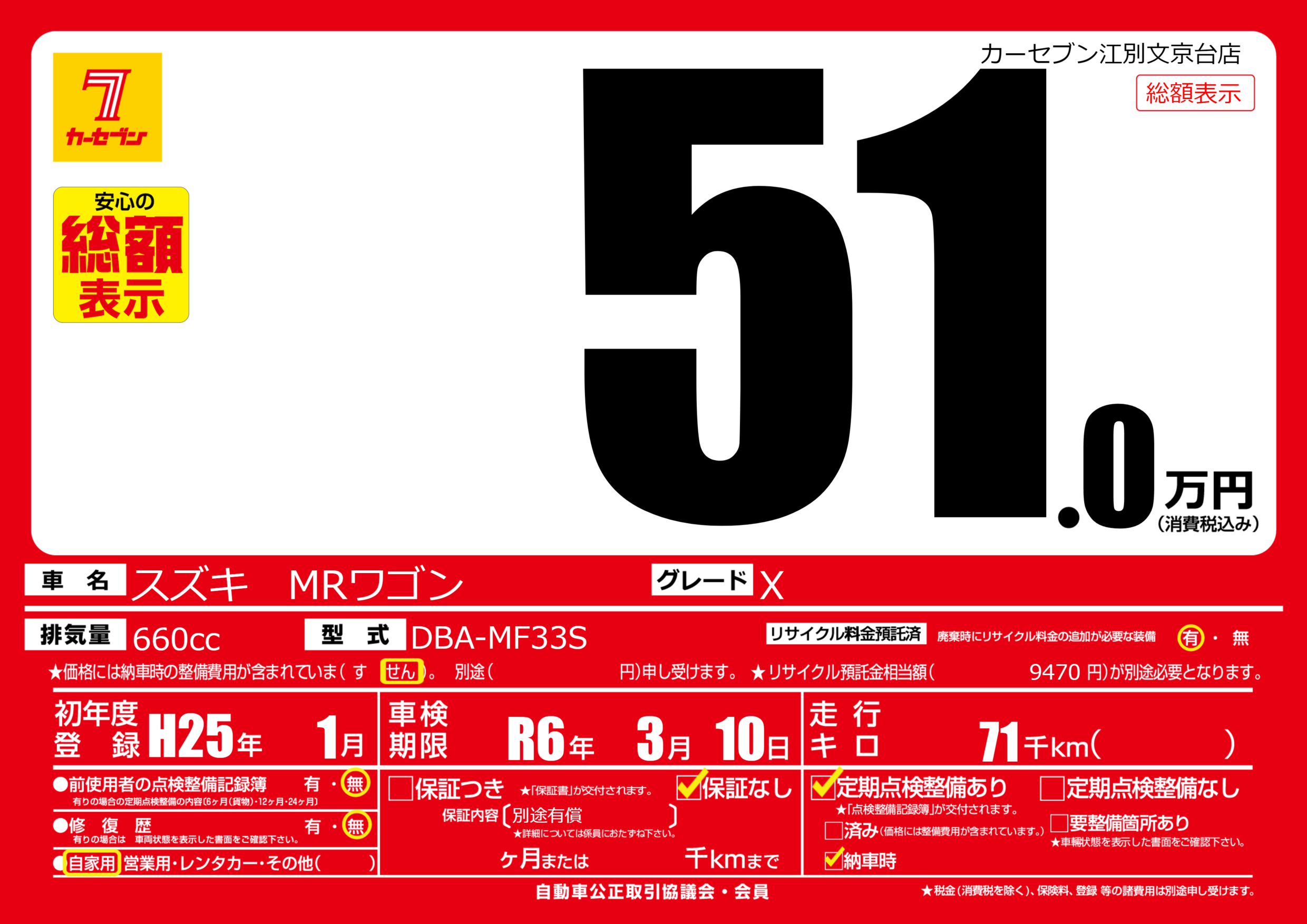 | 走行キロ | 7.1万km | 初年度登録 | H25年1月 |