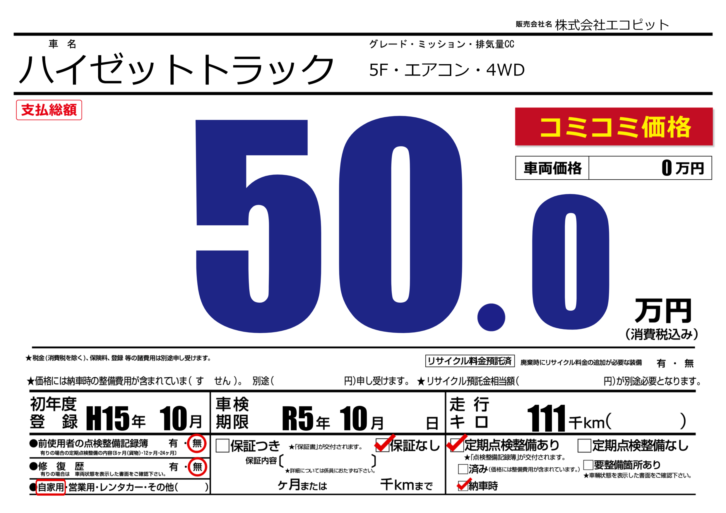 | 車名 | ハイゼットトラック | グレード ミッション 排気量 |