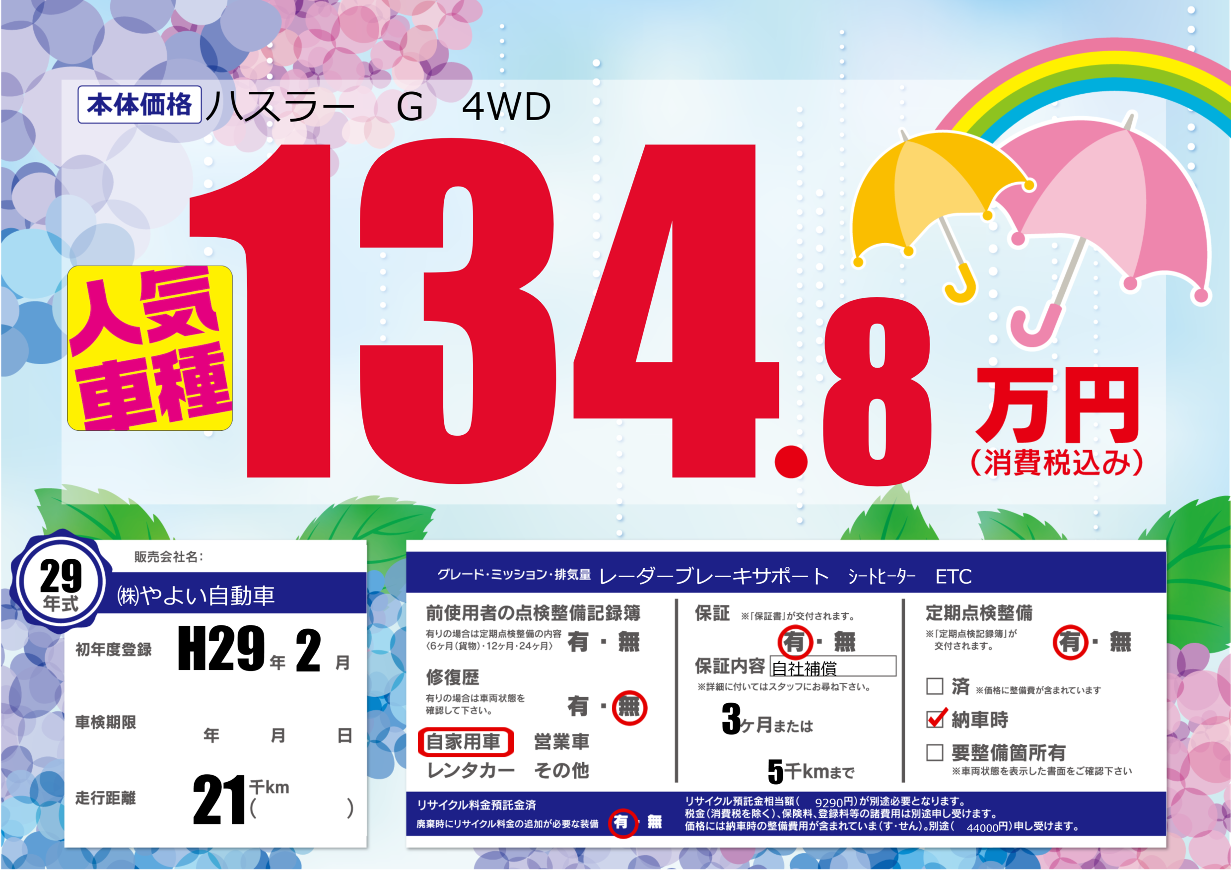 保証付き 保証内容(自社補償) 3ヶ月または(5)千kmまで |