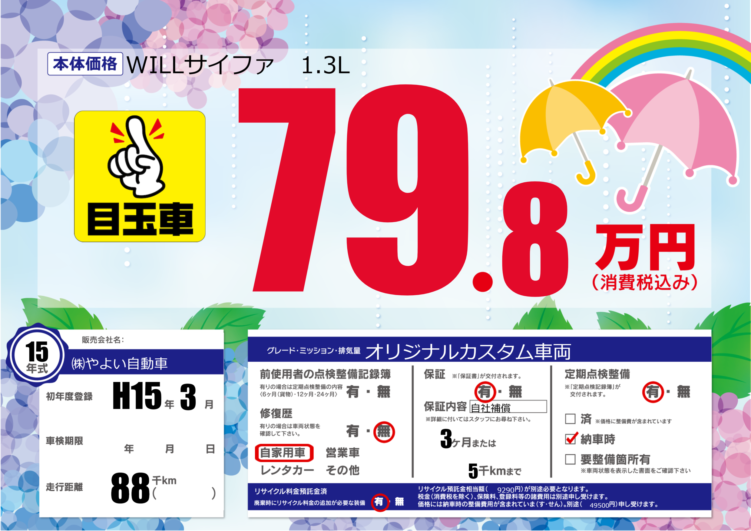 | 走行キロ | 8.8万km | 初年度登録 | H15年3月 |