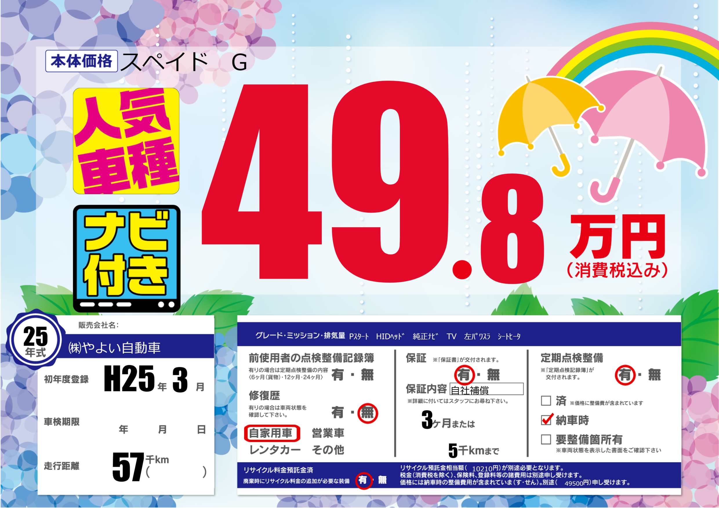 | 車名 | スペイド G | グレード ミッション 排気量 |