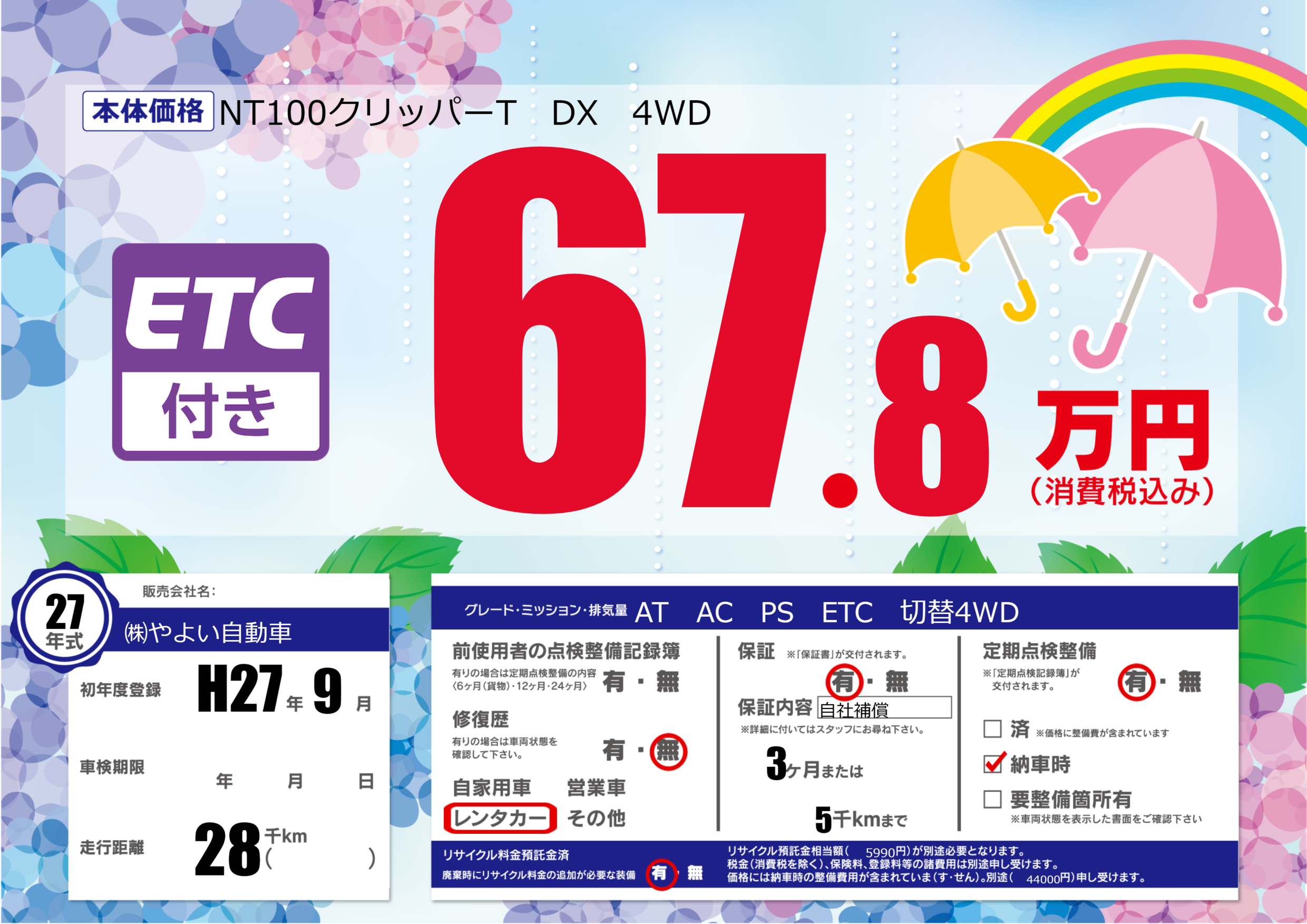 | 車名 | NT100クリッパーT DX 4WD | グレード ミッション 排気量 |