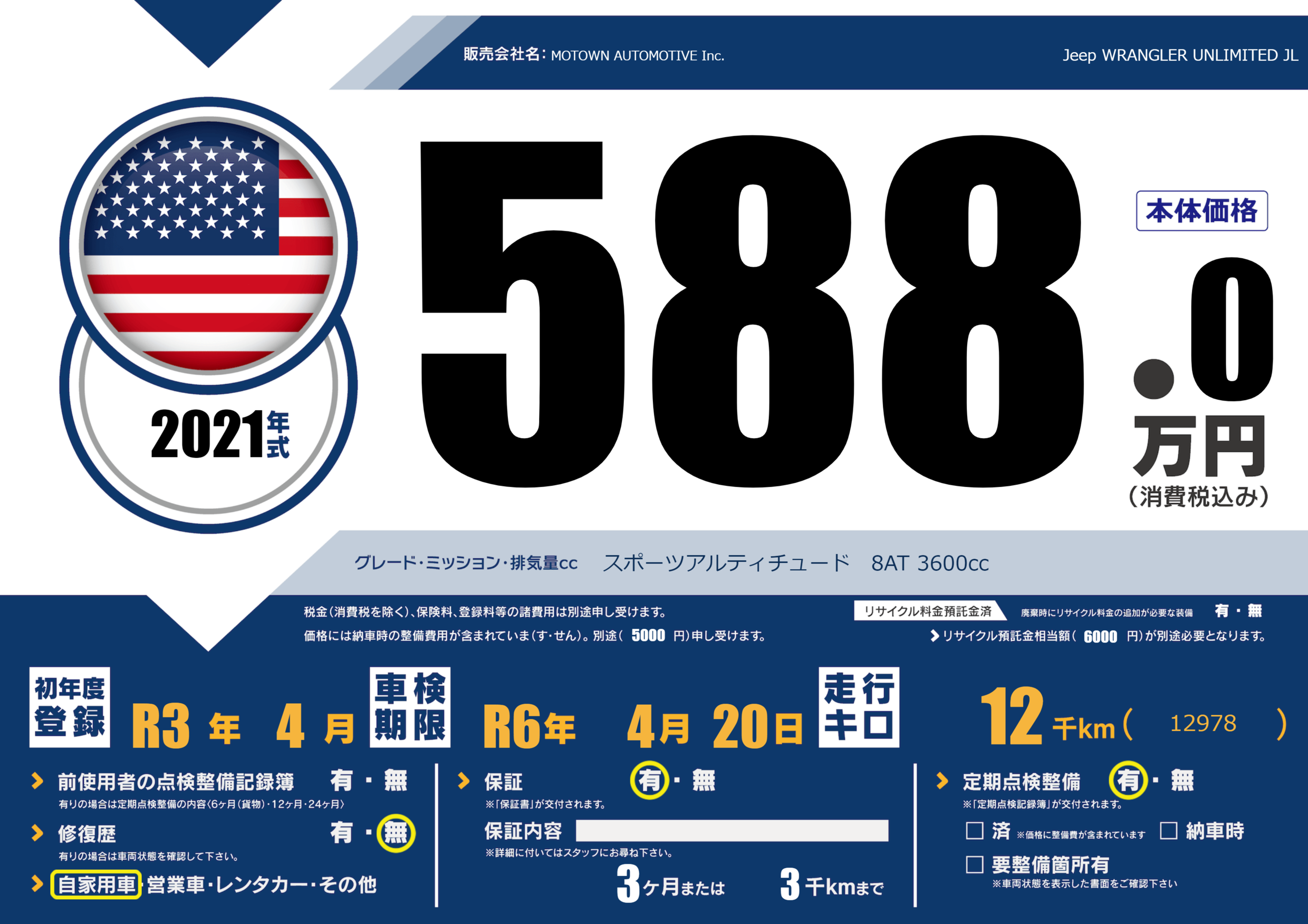 | 車名 | Jeep WRANGLER UNLIMITED JL | グレード ミッション 排気量 |