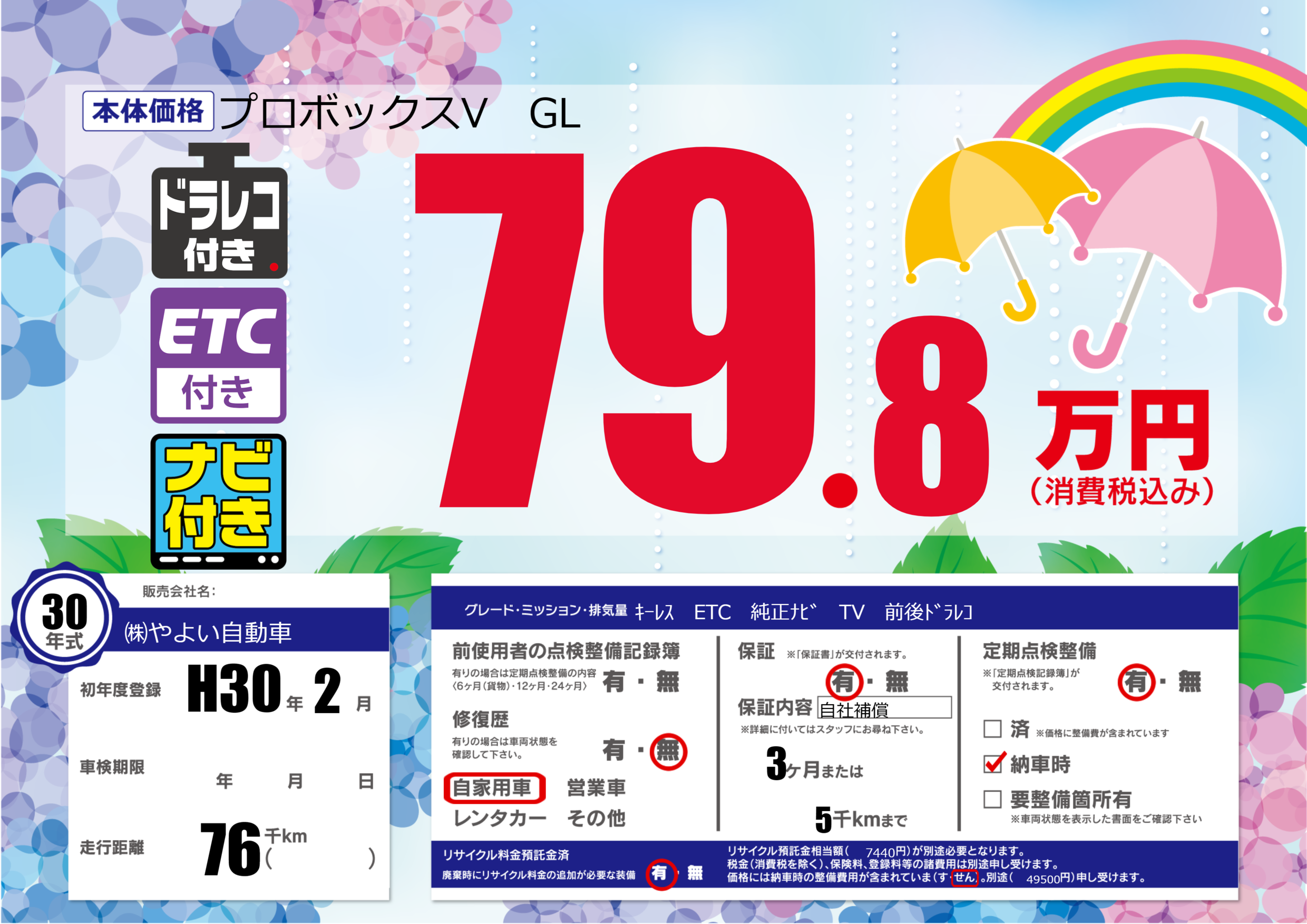 | 走行キロ | 7.6万km | 初年度登録 | H30年2月 |