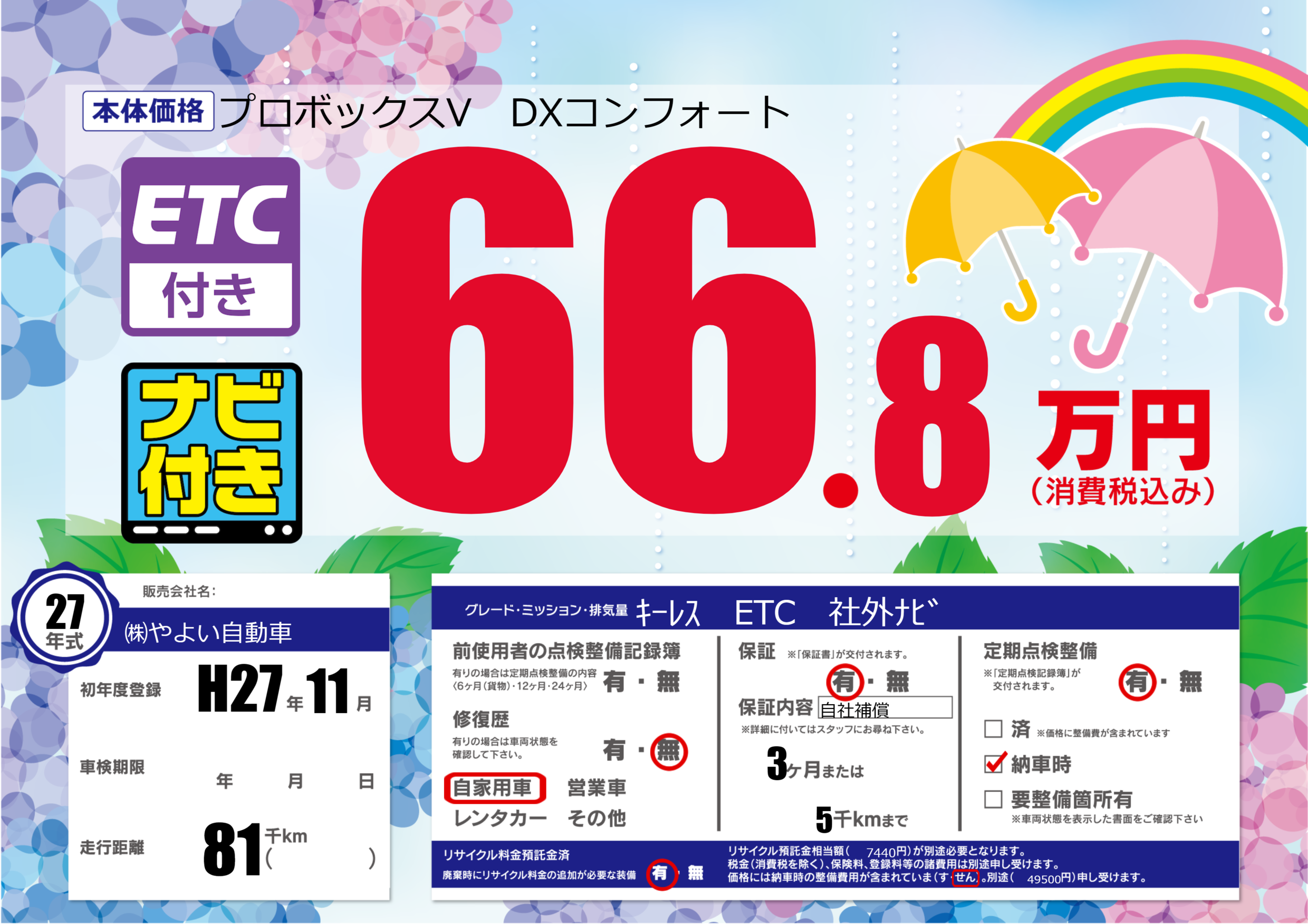 | 車名 | プロボックスV DXコンフォート | グレード ミッション 排気量 |